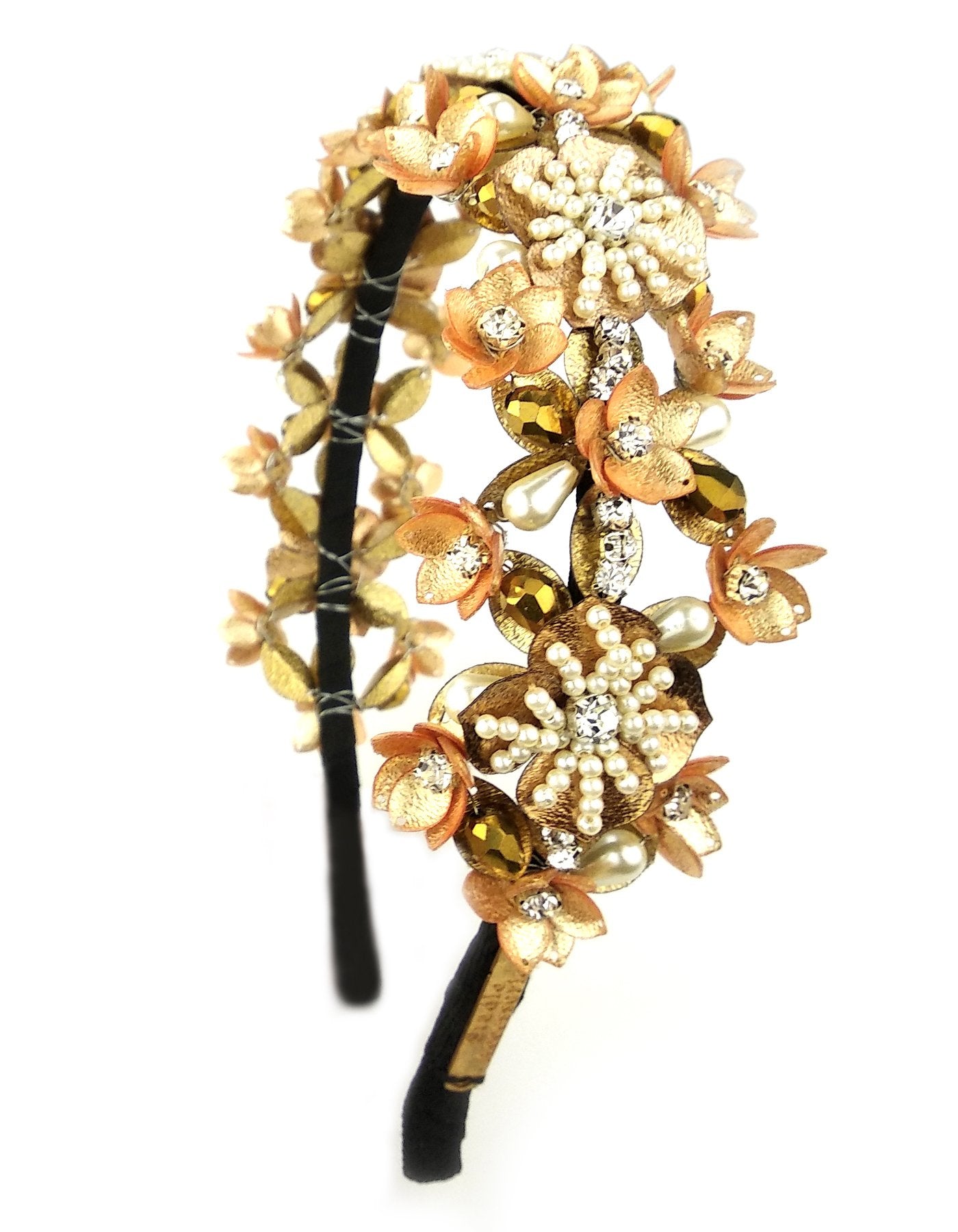 Featuring a Stunning woven hairband with Gold metal sequins, crystals, beads and Pearls floral work embellishment..