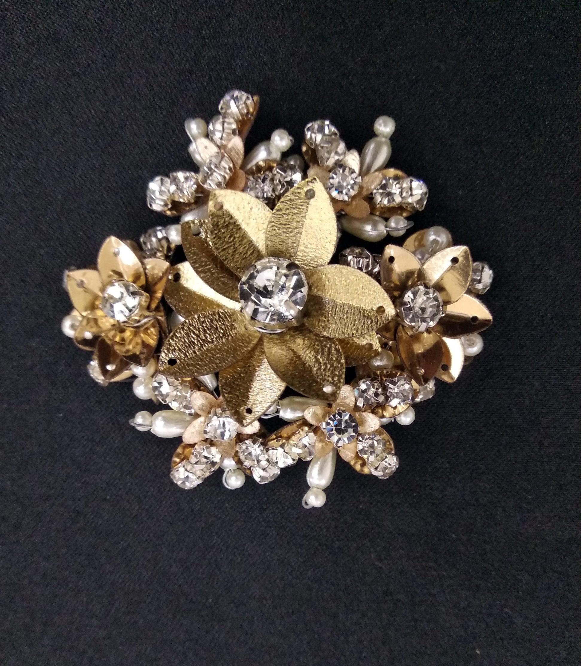 Featuring a Gold Tic Tac hairclip with sequins, pearls and crystal flower motif embellishment, set in steel.