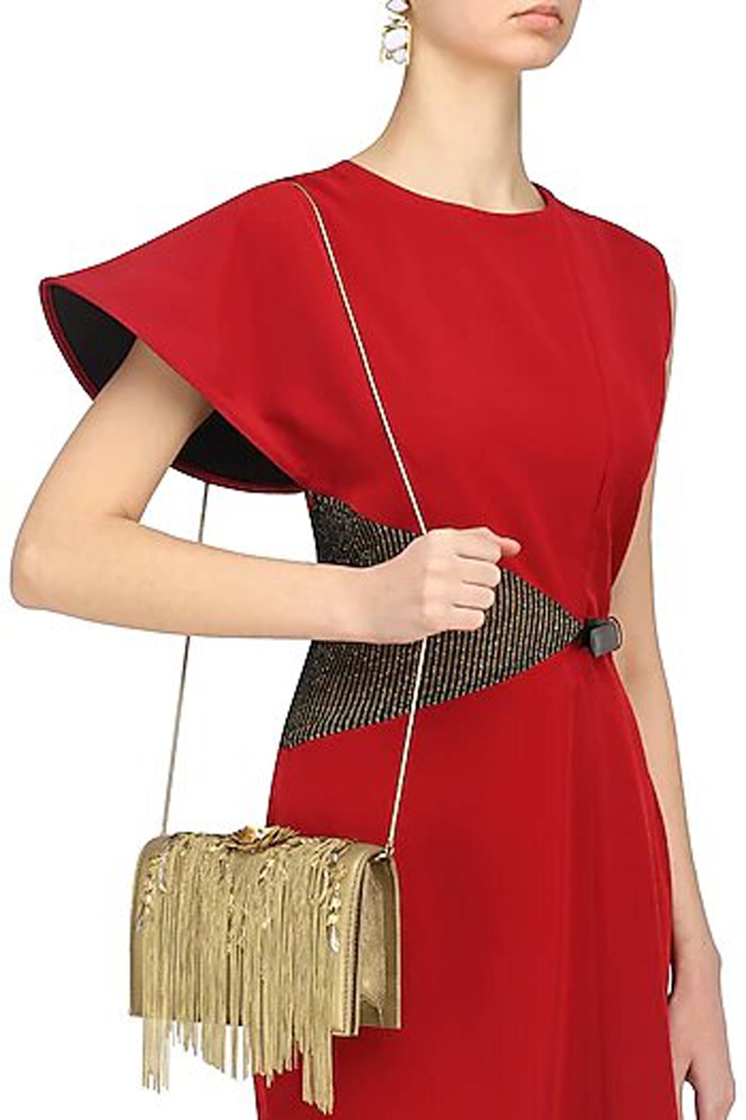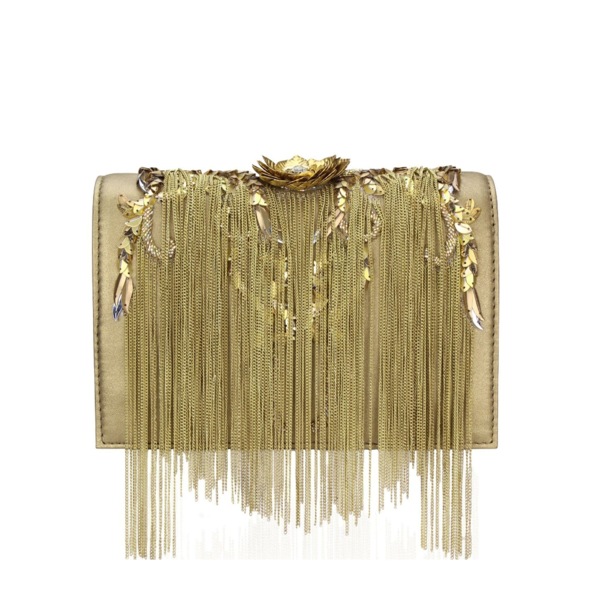 Featuring a gold clutch bag made of pure leather with a golden flowery design and chains hanging. It comes with a adjustable chain.