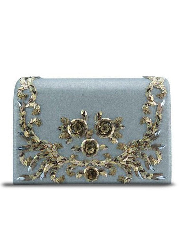 Featuring a hand beaded clutch bag with a gold flowery wreath design on linen. It comes with a adjustable chain and gives a classy look to your ensemble.