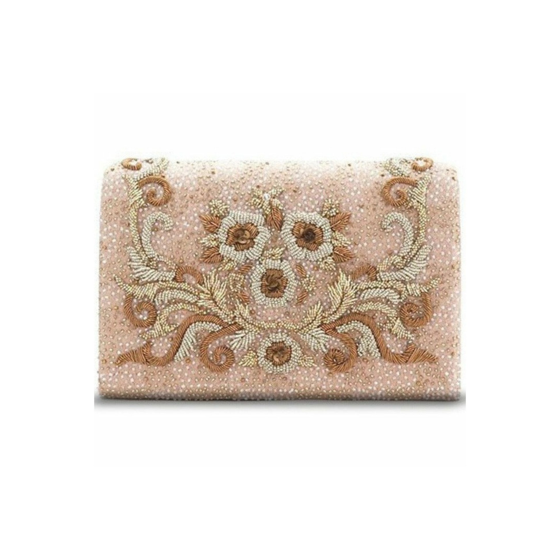Featuring a nude colored hand beaded clutch bag. This is embellished with gold silver flower motifs and tiny sequence all over the bag, suspended with a sling chain.