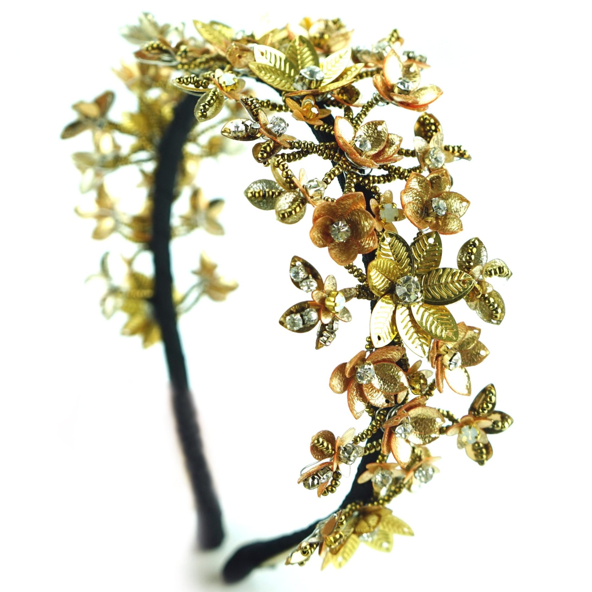 Featuring a woven hairband with Gold metal sequins, crystal stones and beaded floral work embellishment.