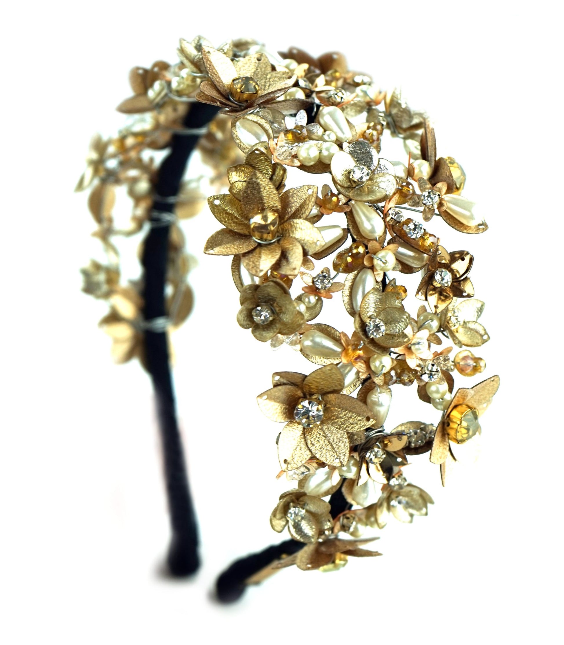 Featuring a woven hairband with Gold metal sequins, crystal stones and pearls floral work embellishment.