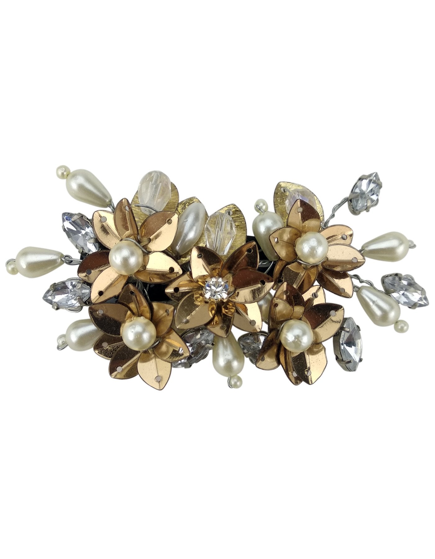 Featuring a Gold & Silver Tic Tac hairclip with sequins, pearls, beads and crystals flower motif embellishment, set in steel.