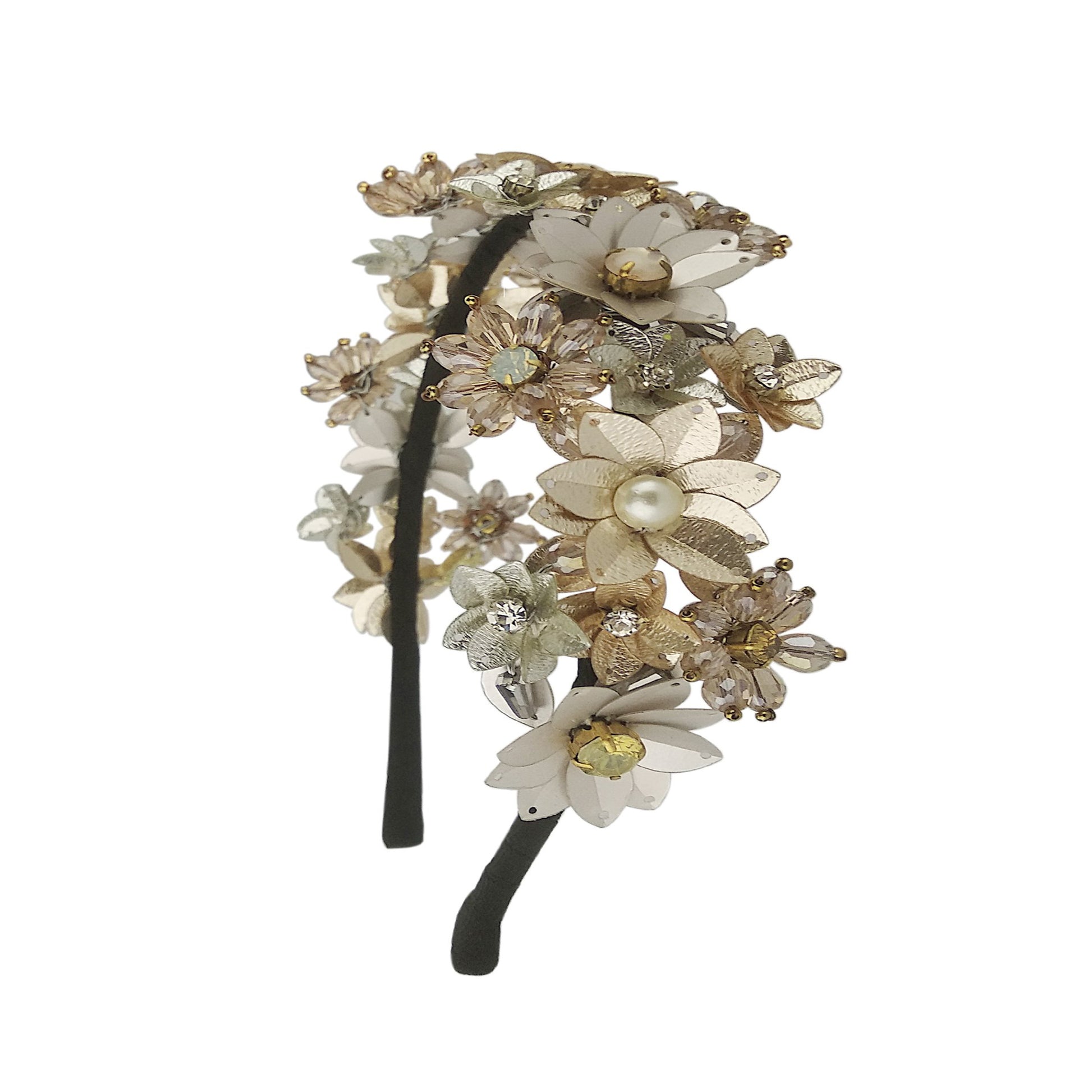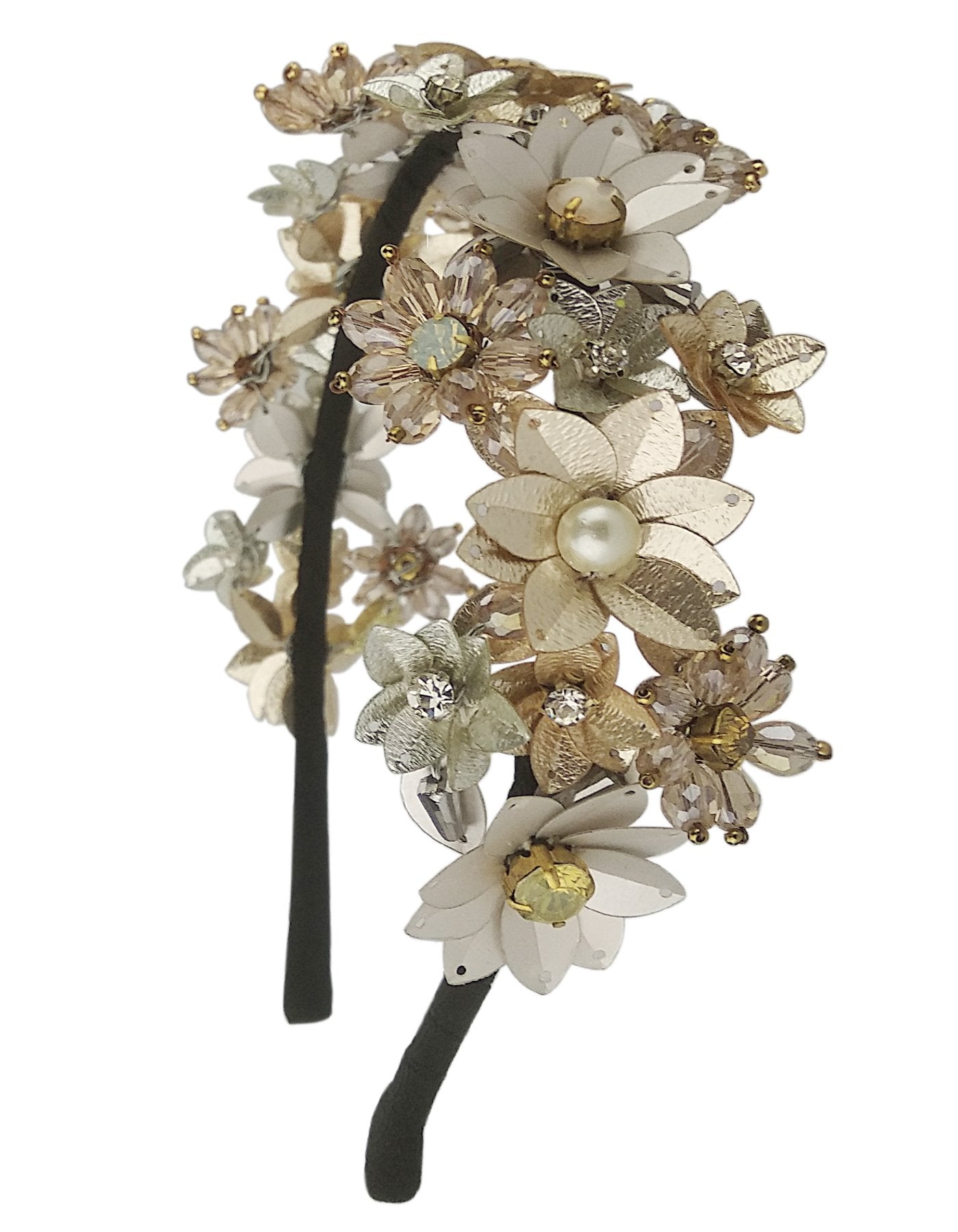 Featuring a Stunning woven hairband with Gold & Silver metal sequins, crystals, beads and Pearls floral work embellishment.