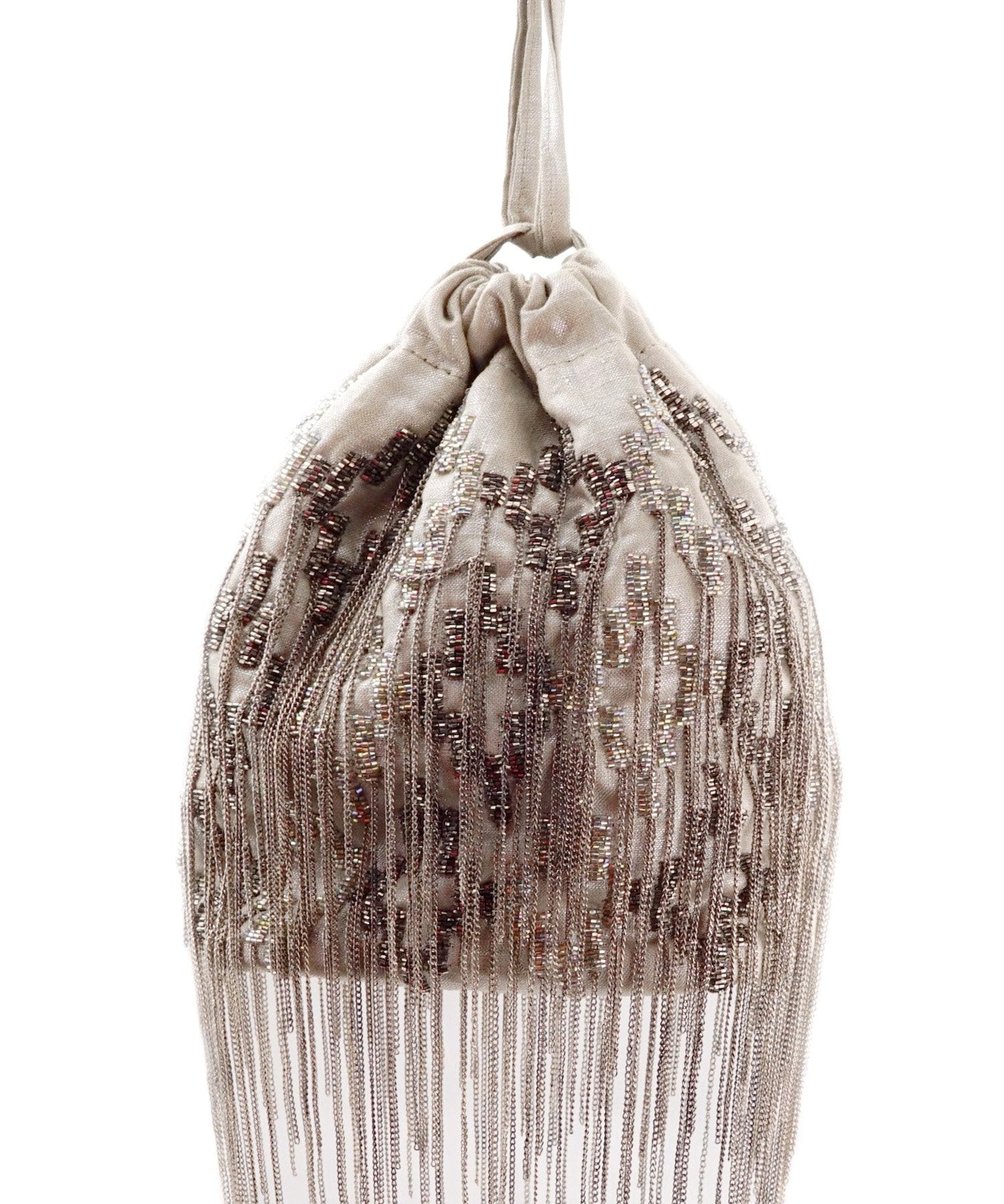 Featuring a Grey color potli bag made of fabric embellished with Multicolor beads with silver chains hanging all over. It has adjustable drawstring handle.
