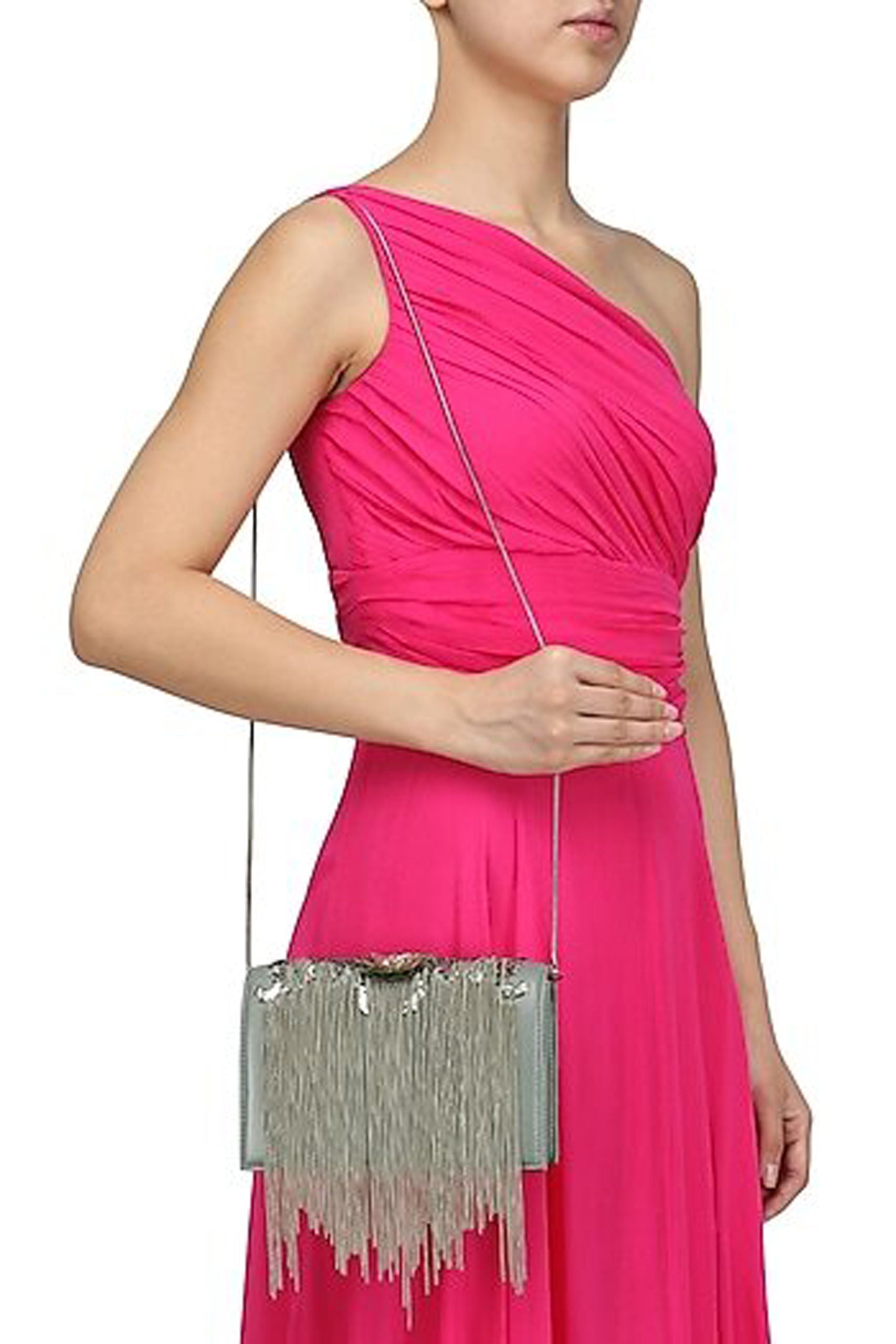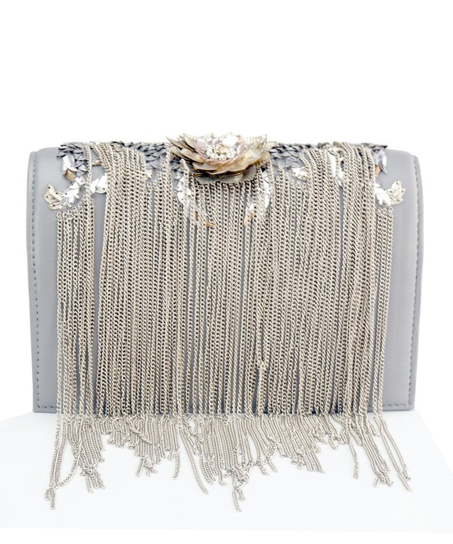Featuring a Grey clutch bag made of pure leather with a silver flowery design and chains hanging. It comes with a adjustable chain.