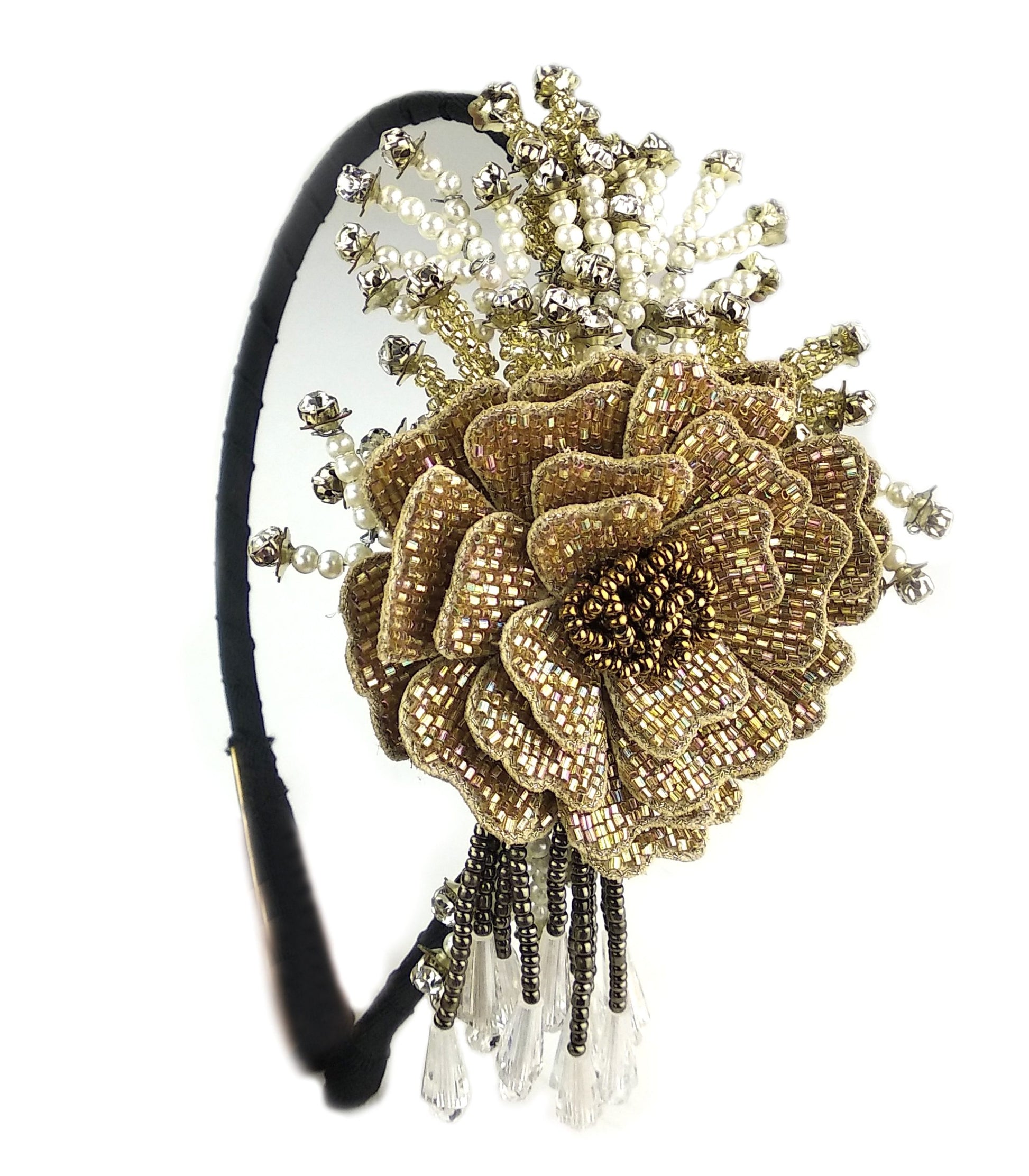 Featuring a Partywear Gold flower woven hairband with Beads, Crystals and Pearls embellishment..