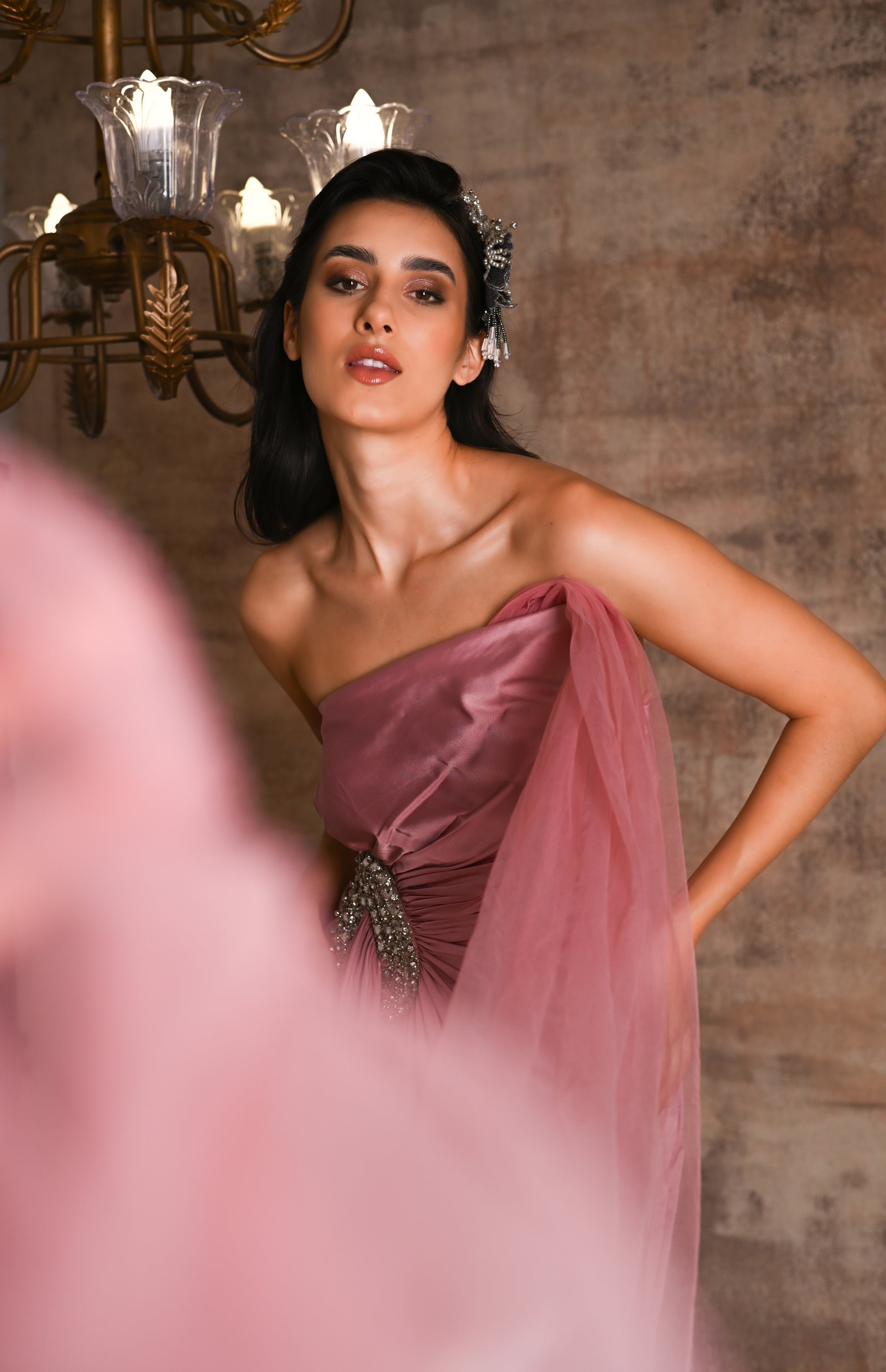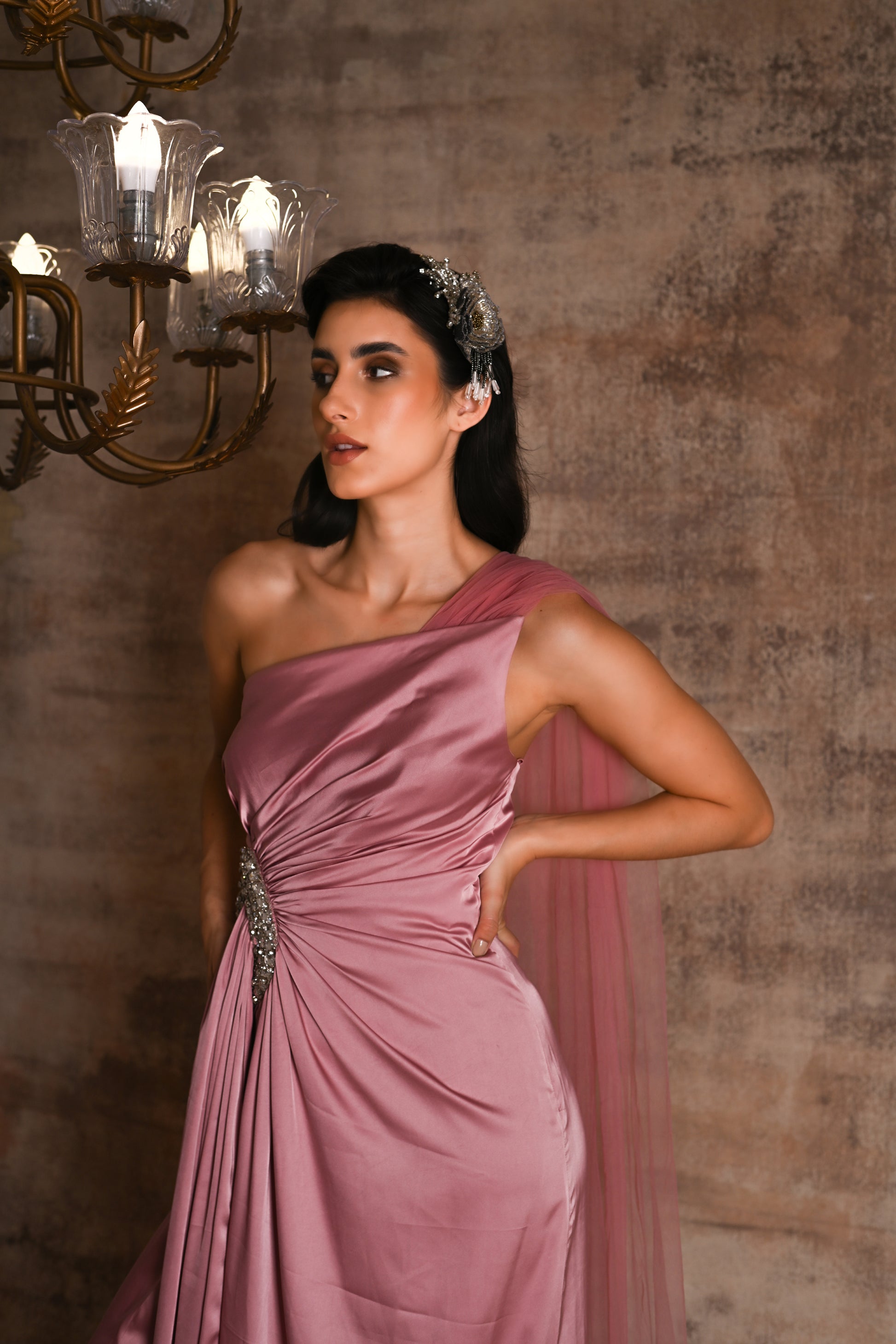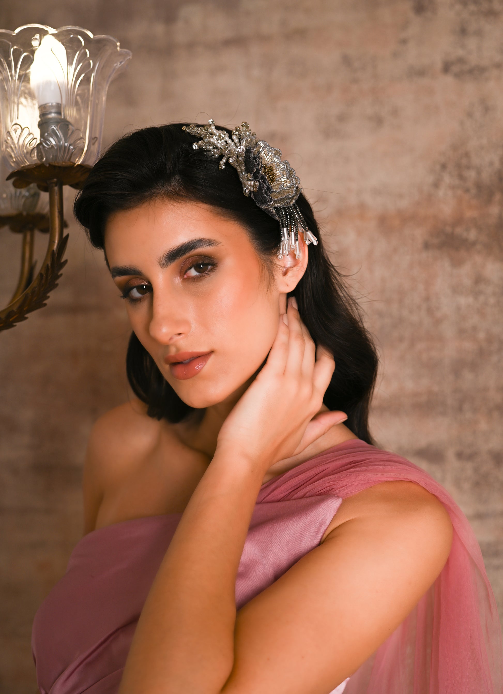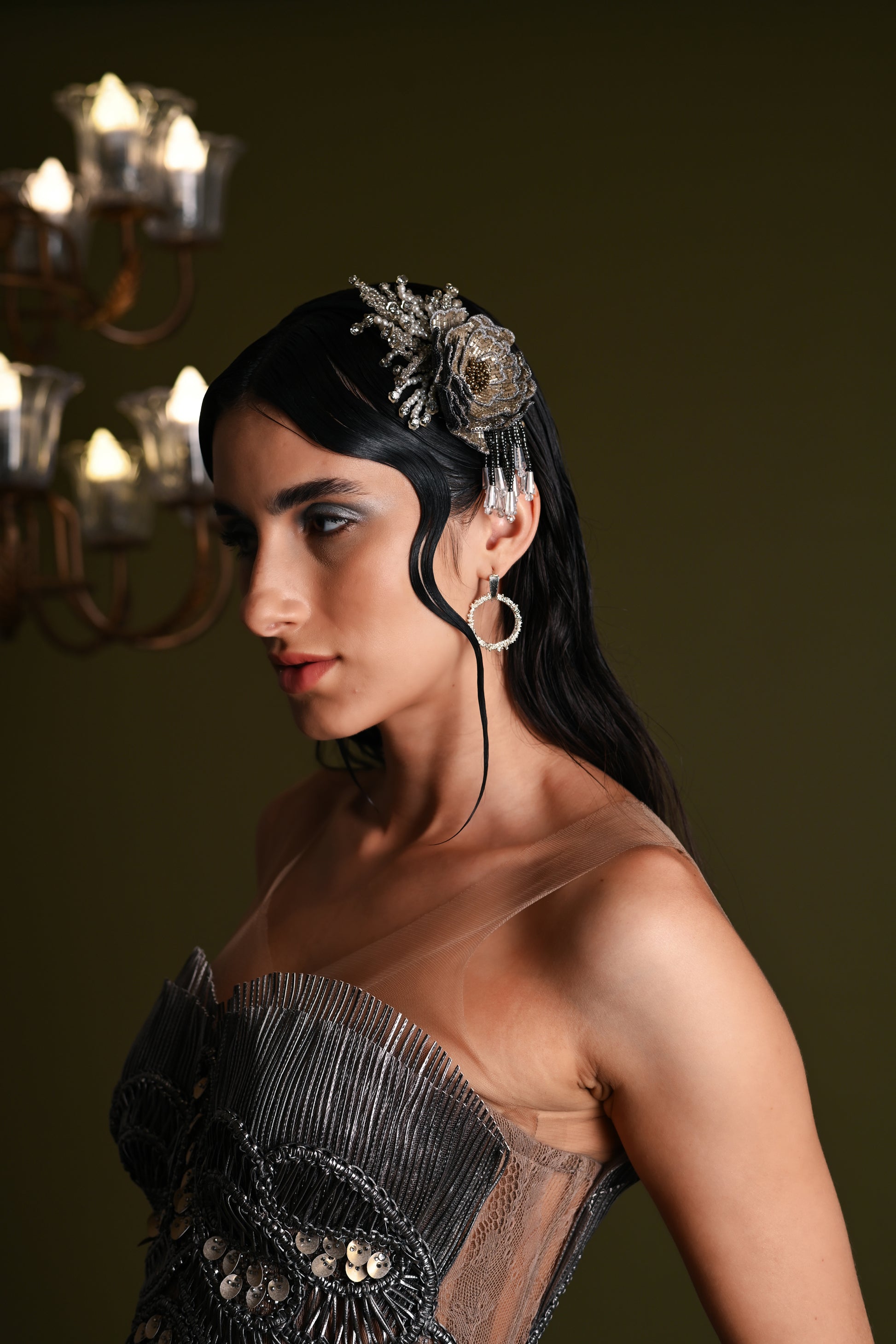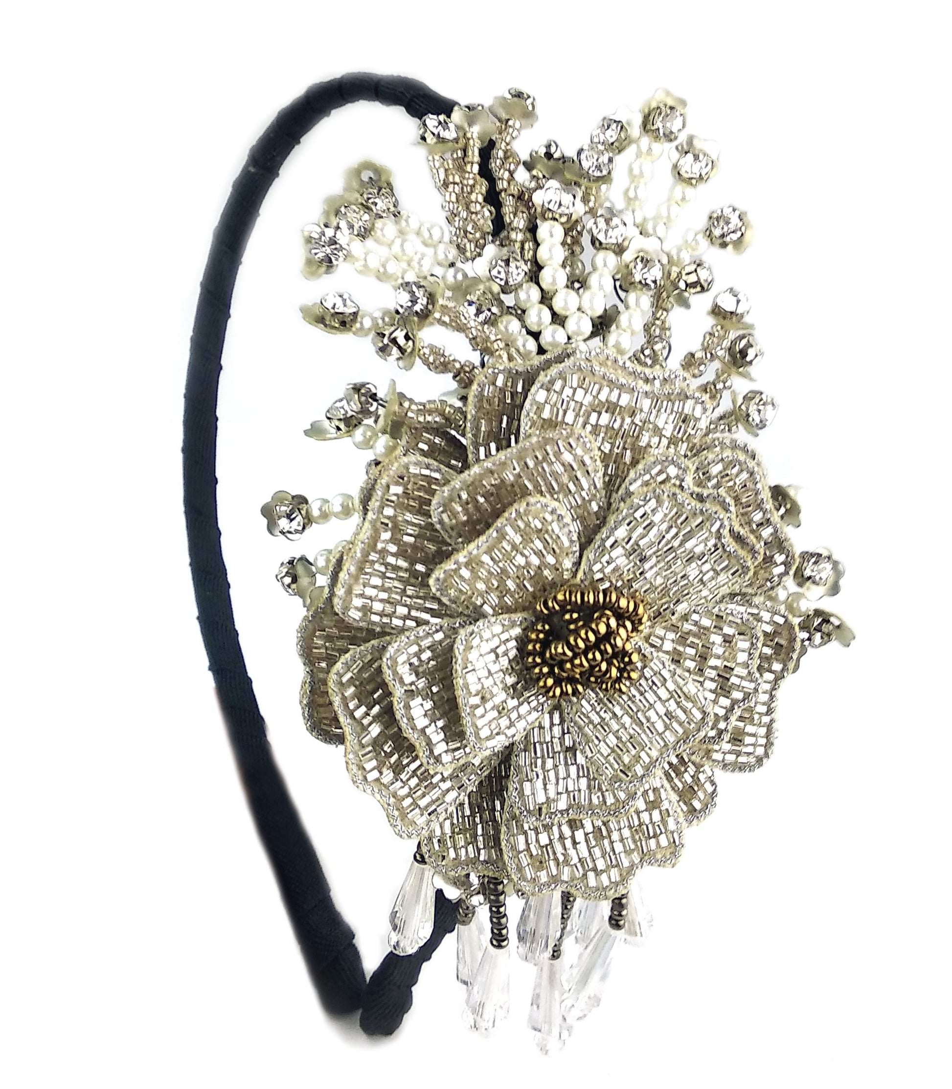 Featuring a Partywear Silver flower woven hairband with Beads, Crystals and Pearls embellishment.