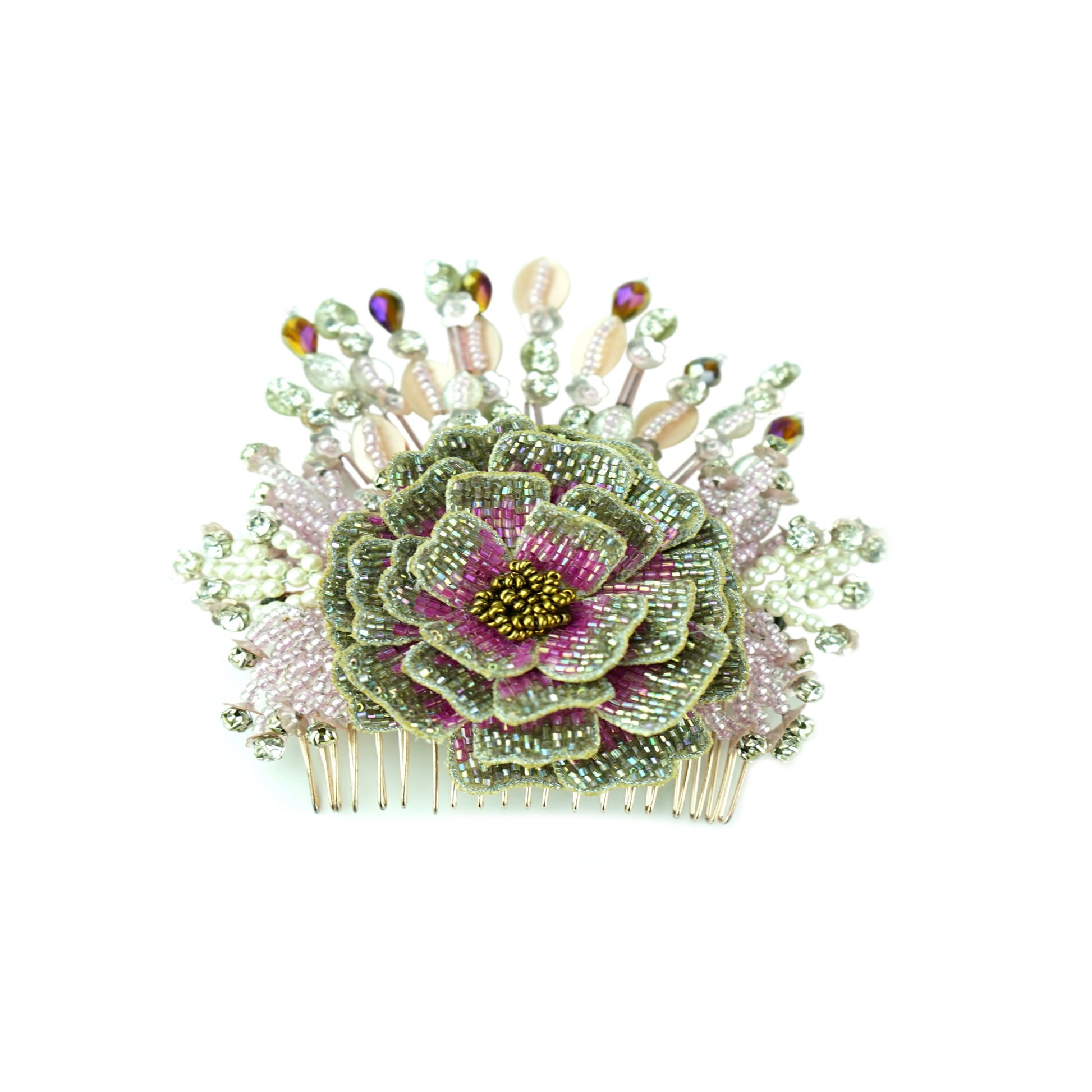 Featuring a Partywear Pink flower haircomb with crystals, beads, metal and sequins embellishment..