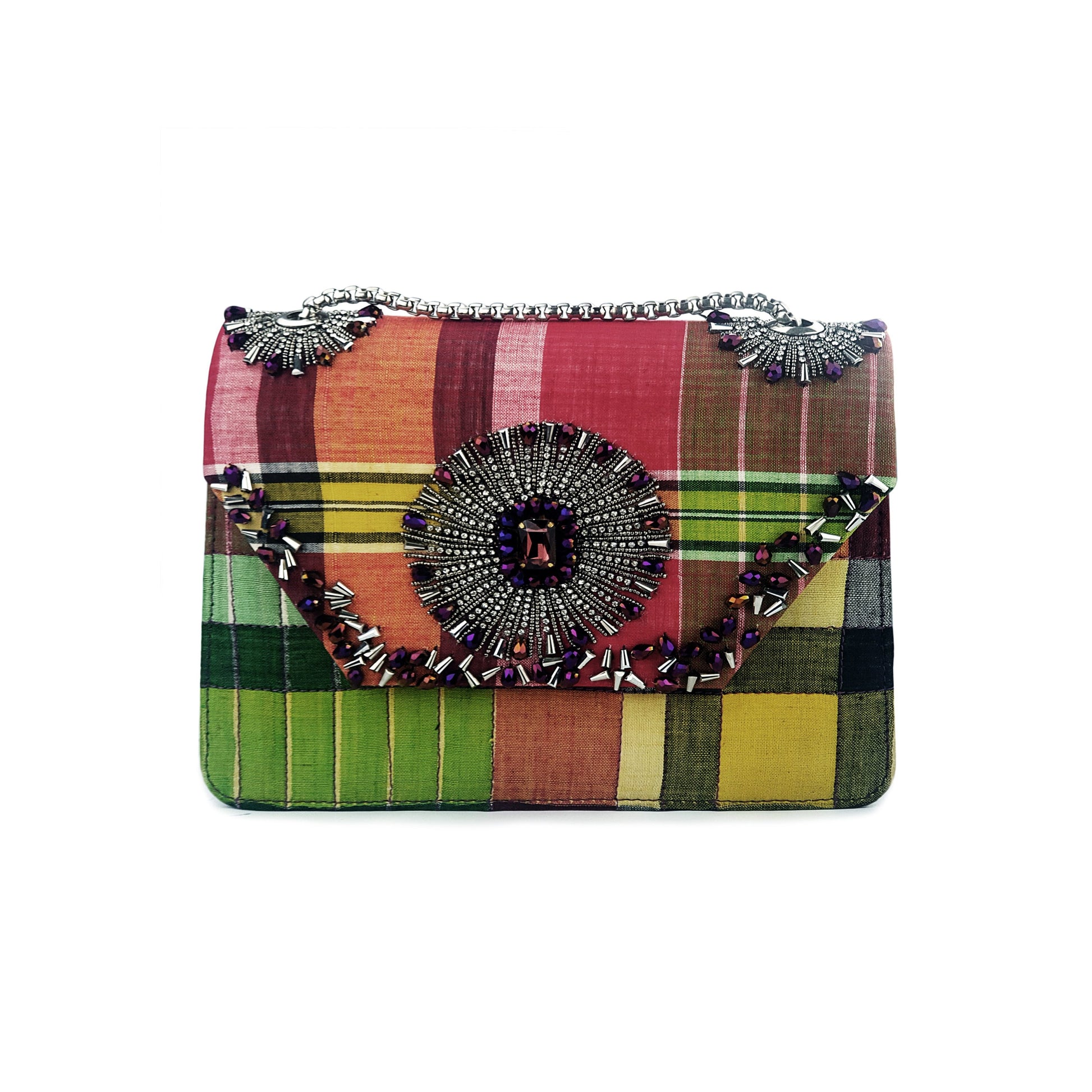 Featuring a Stunning Multicolor cotton check hand beaded bag with crystals and beads embellishment..
