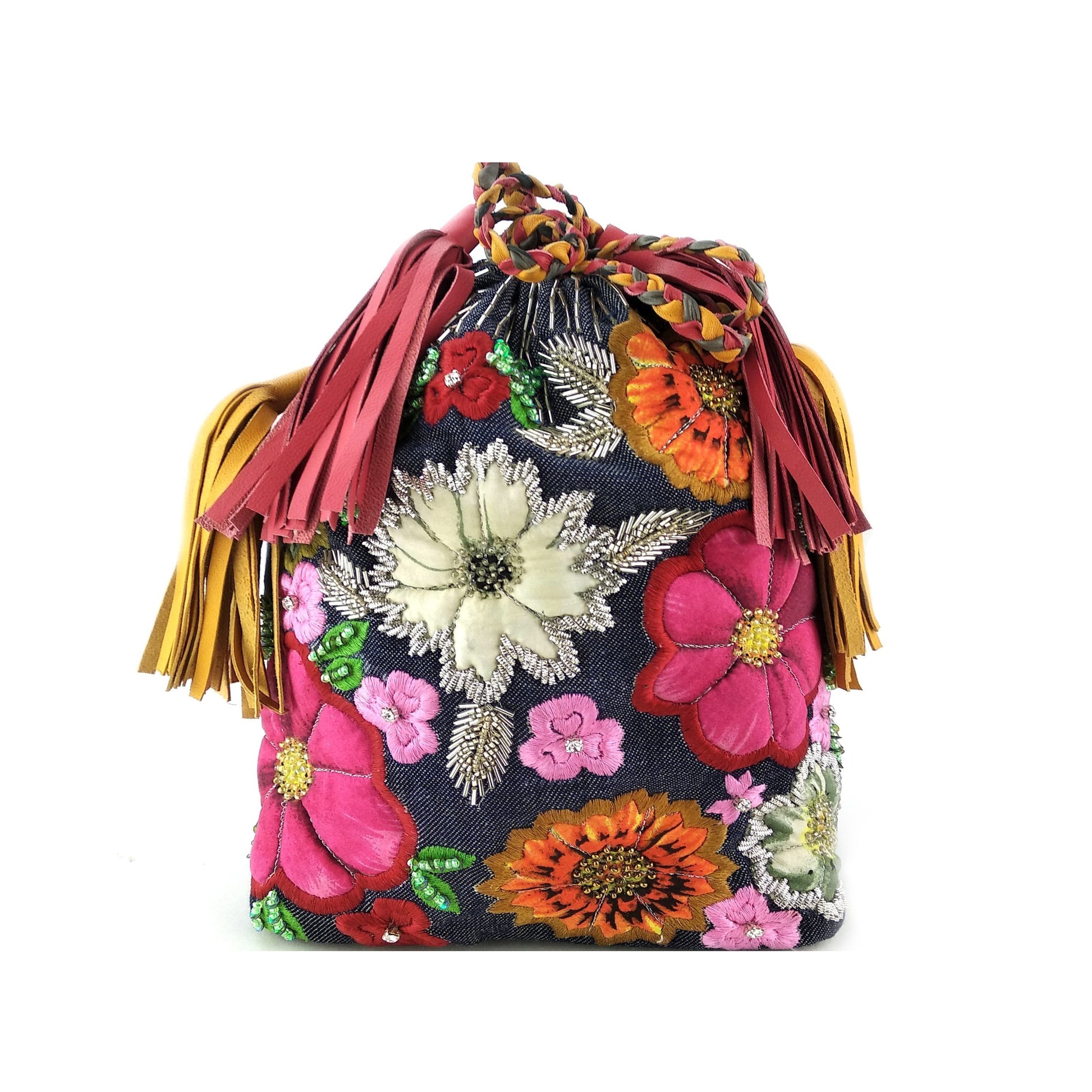 Featuring a Beautiful Multicolor floral Denim hand embroidery Potli bag with crystals, beads and leather tassels embellishment.