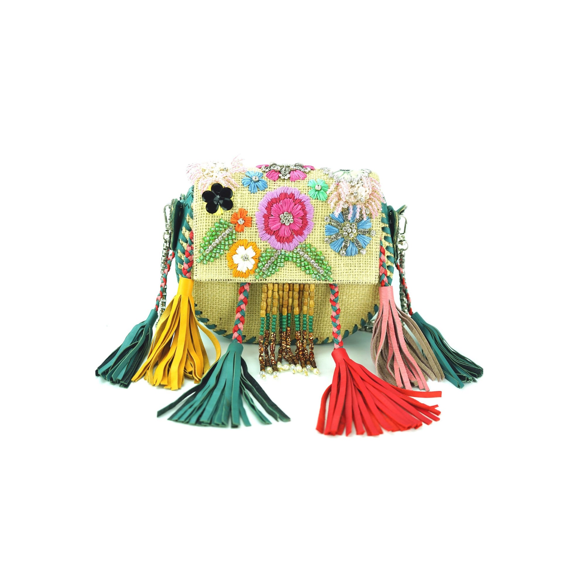Featuring a Multicolor floral Woven Leather hand embroidery clutch bag with crystals, sequins, beads and leather tassels embellishment, suspended with a Silver sling chain.