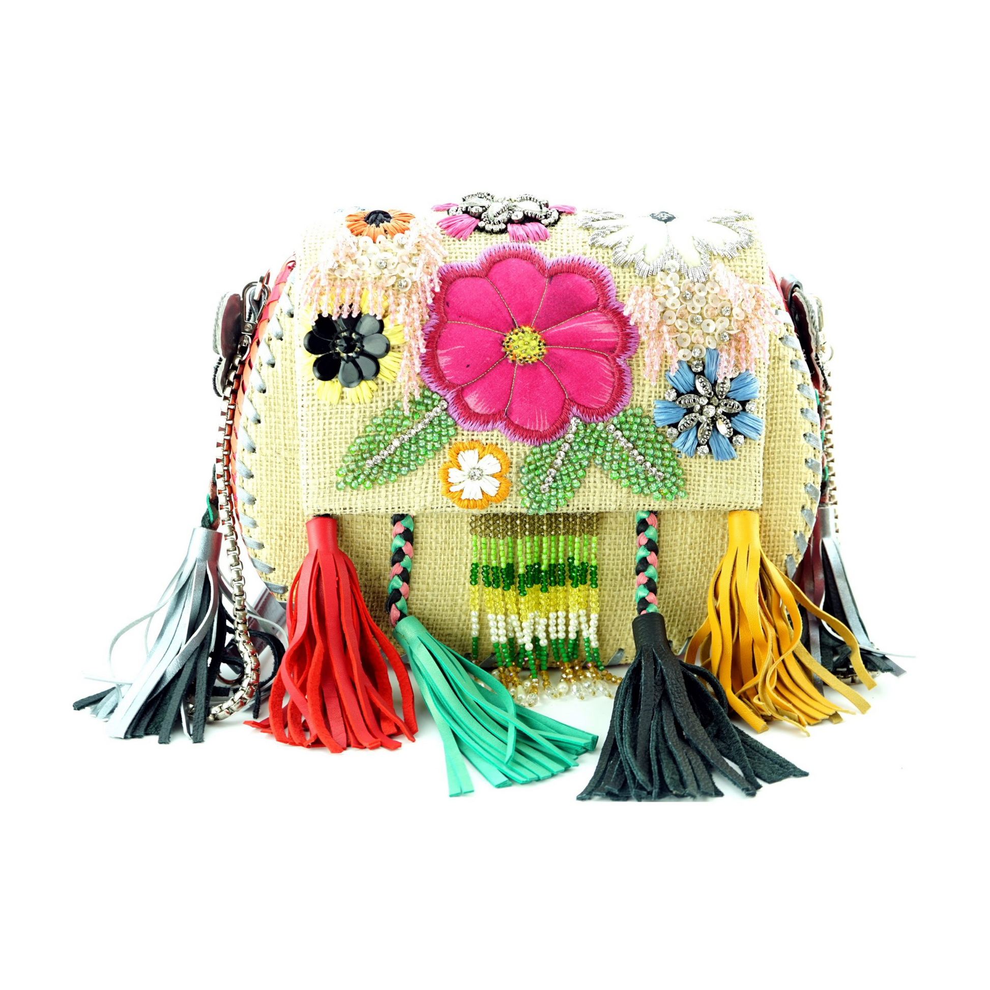 Featuring a Multicolor floral Woven Leather hand embroidery clutch bag with crystals, sequins, beads and leather tassels embellishment, suspended with a Silver sling chain..