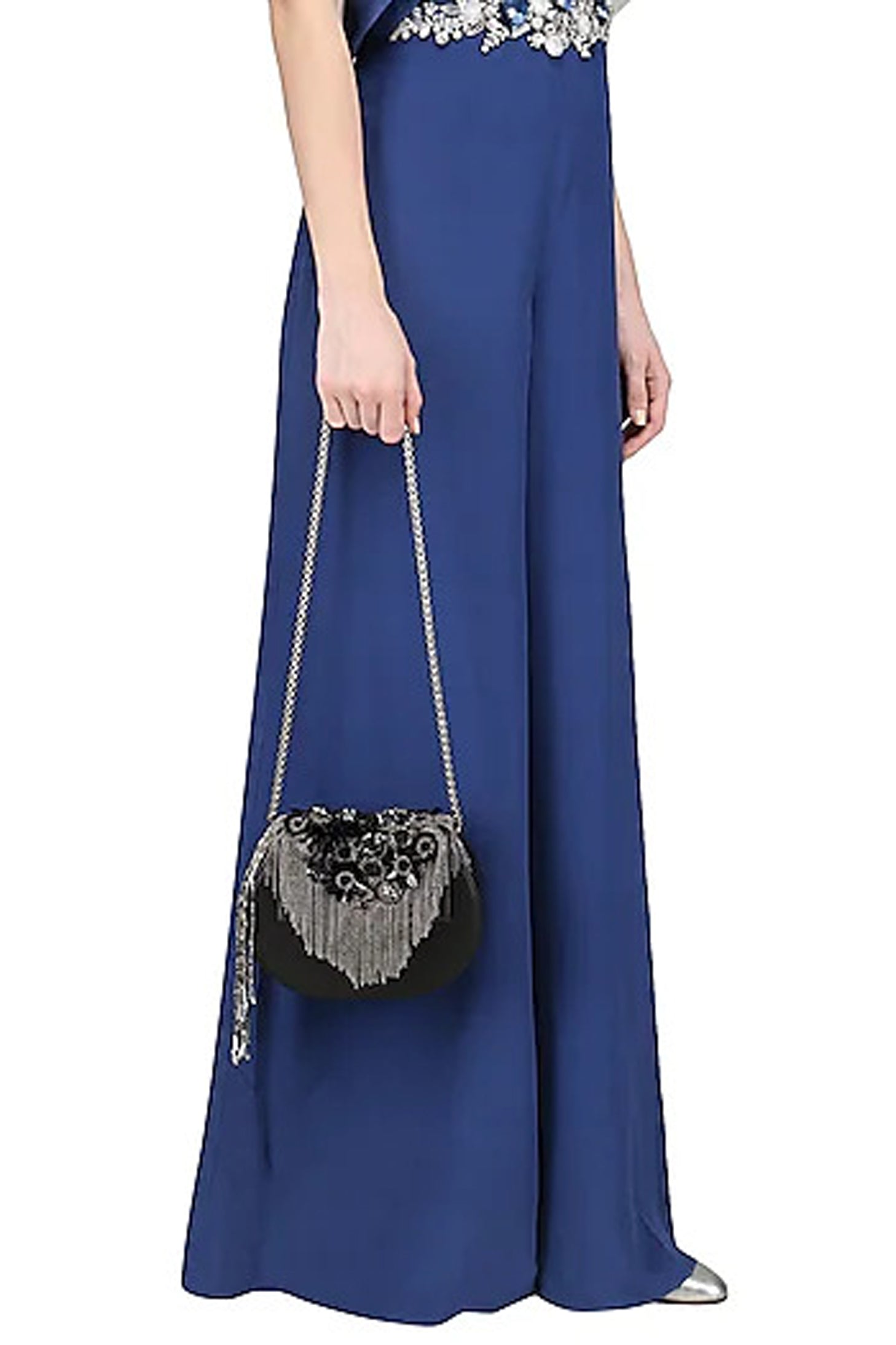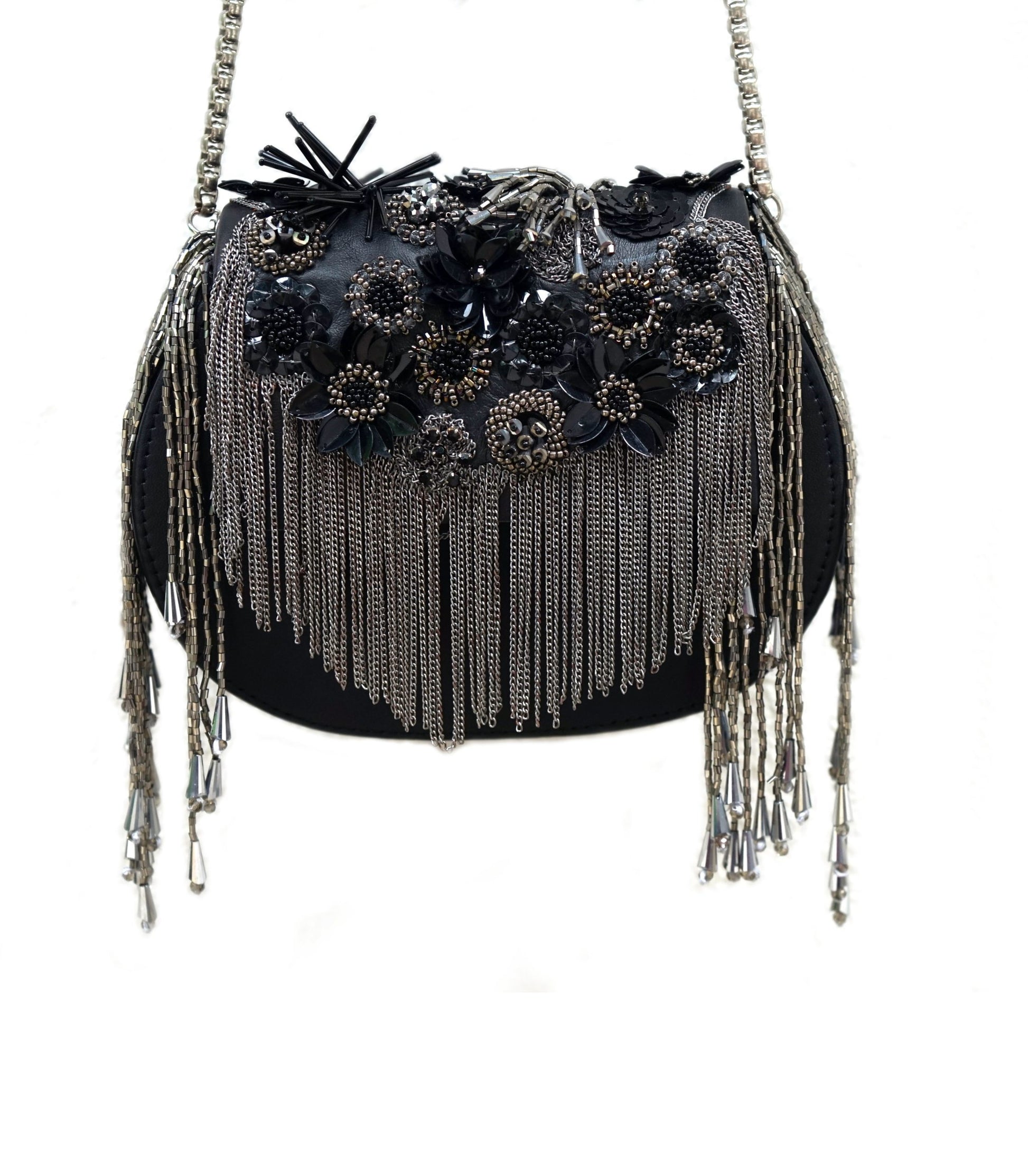 Featuring a Black Partywear stunning floral leather clutch bag with crystals, sequins, beads, chains and tassels embellishment, suspended with a Silver sling chain.