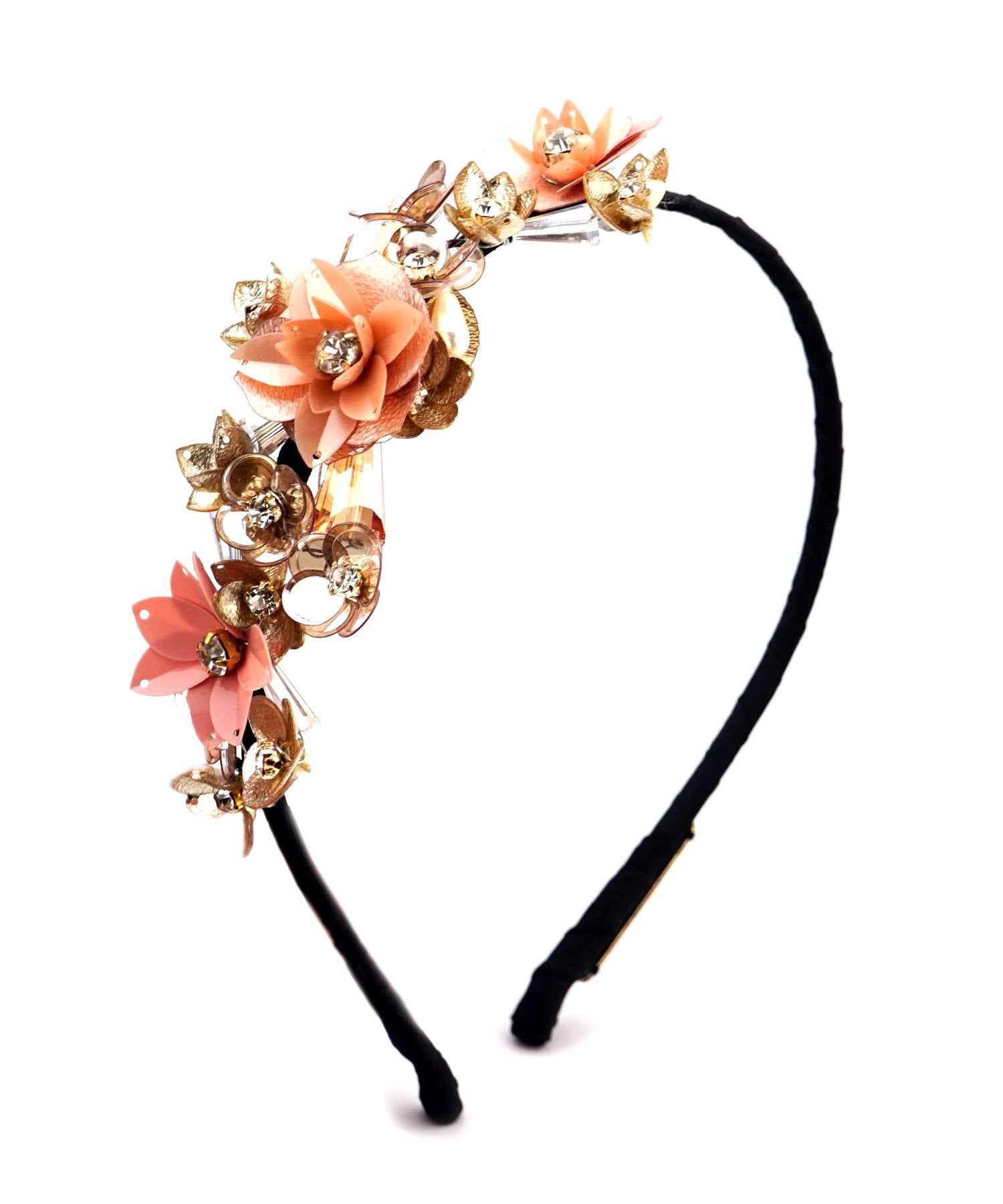 Featuring a woven hairband with peach and gold metal sequins and crystal stone floral work embellishment.