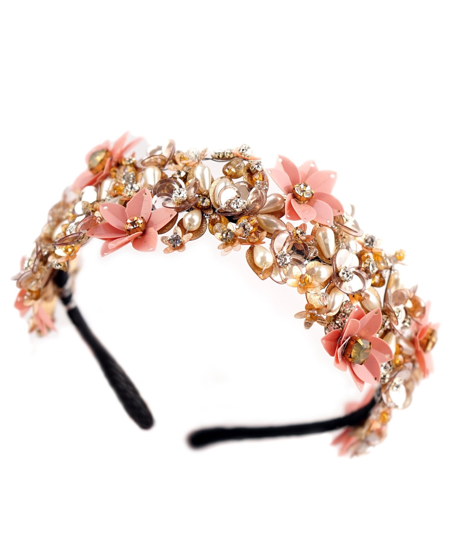 Featuring a woven hairband with peach and gold_silver metal sequins and crystal stone floral work embellishment.