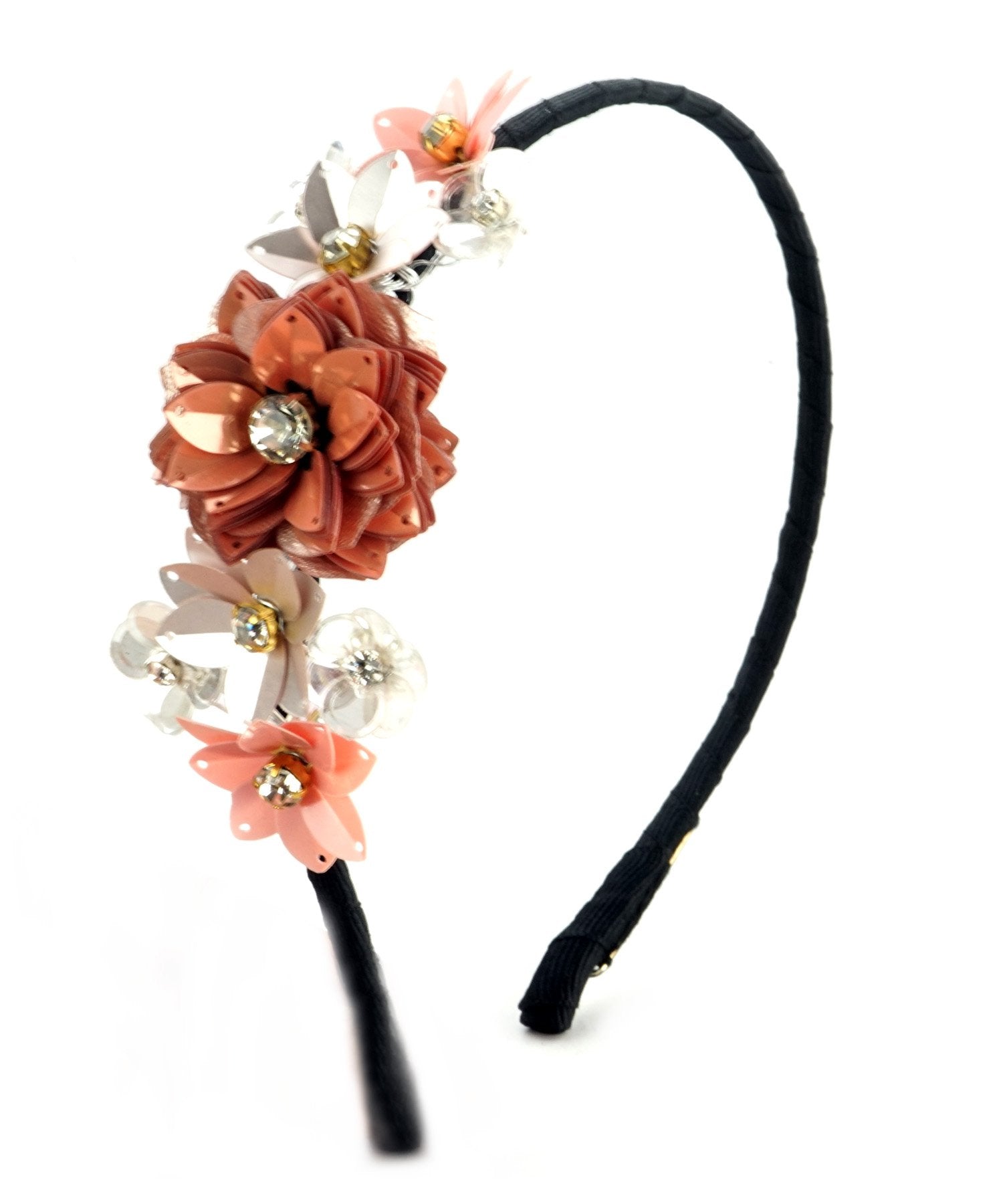Featuring a Peach and silver flower woven hairband with metal sequins and crystal stones floral work embellishment.
