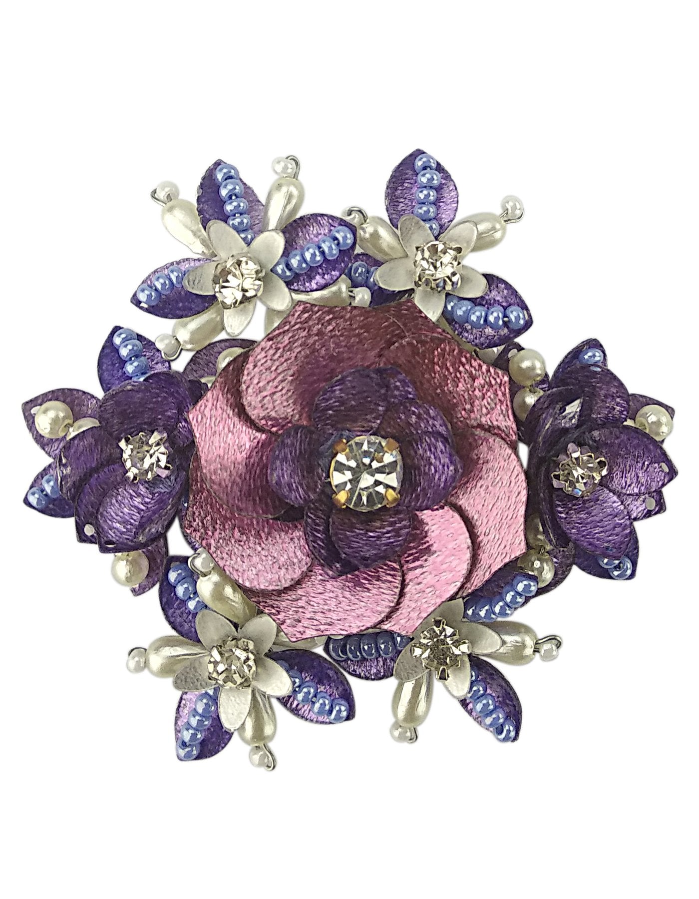 Featuring a Tic Tac hairclip with Purple sequins, beads, pearls and Silver crystals flower motif embellishment, set in steel..