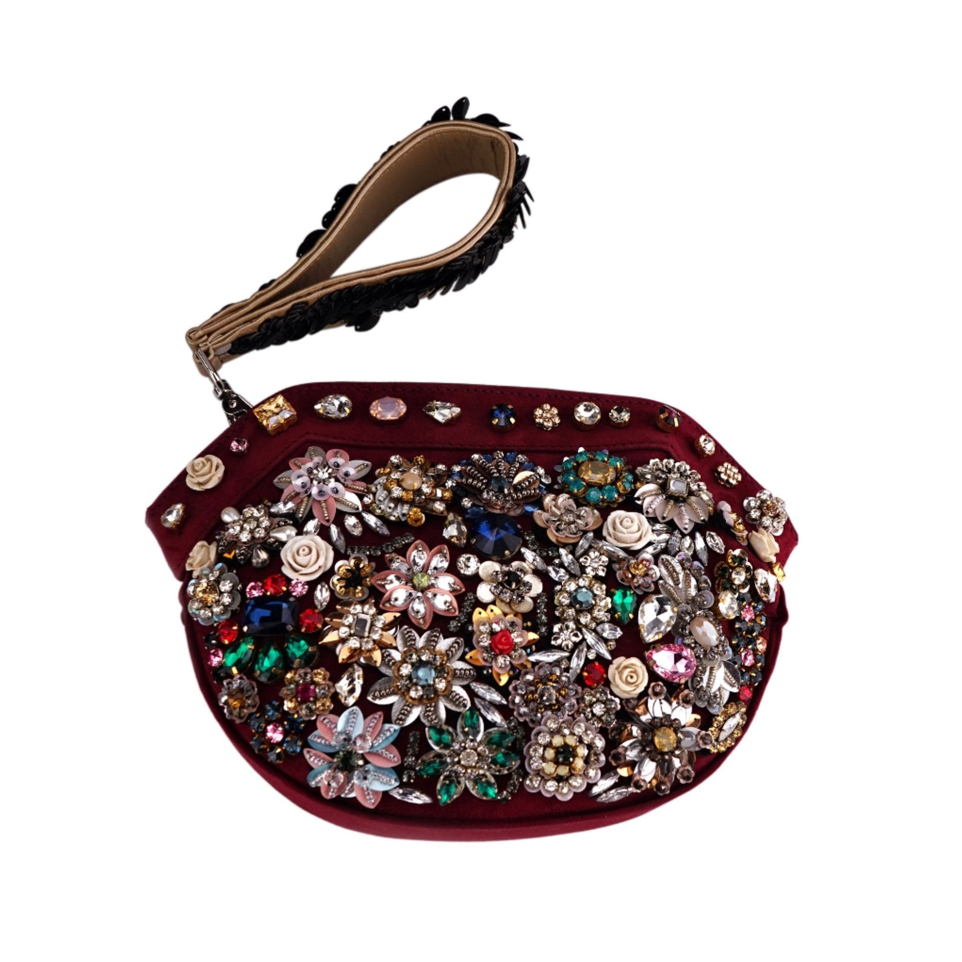 Featuring a Red base Multicolor Floral clutch bag in leather with multicolor crystal and sequins embellishment, suspended with an floral Leather strap.