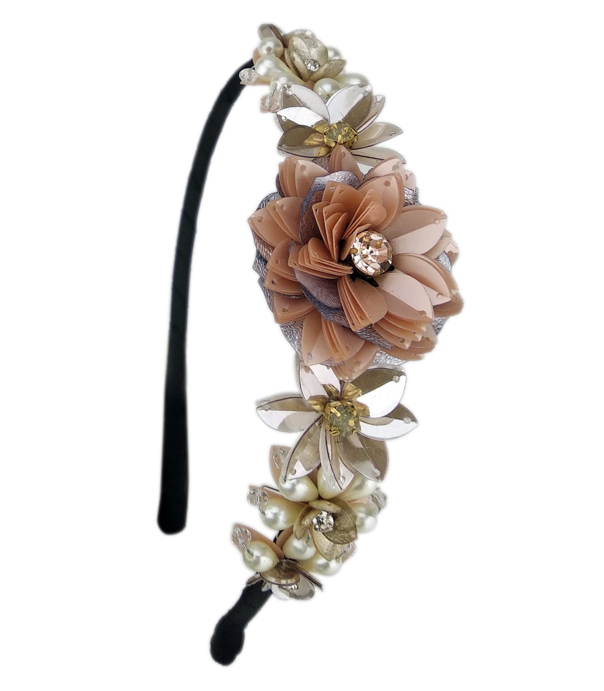 Featuring a Silver and Peach flower woven hairband with metal sequins and crystal stones floral work embellishment.