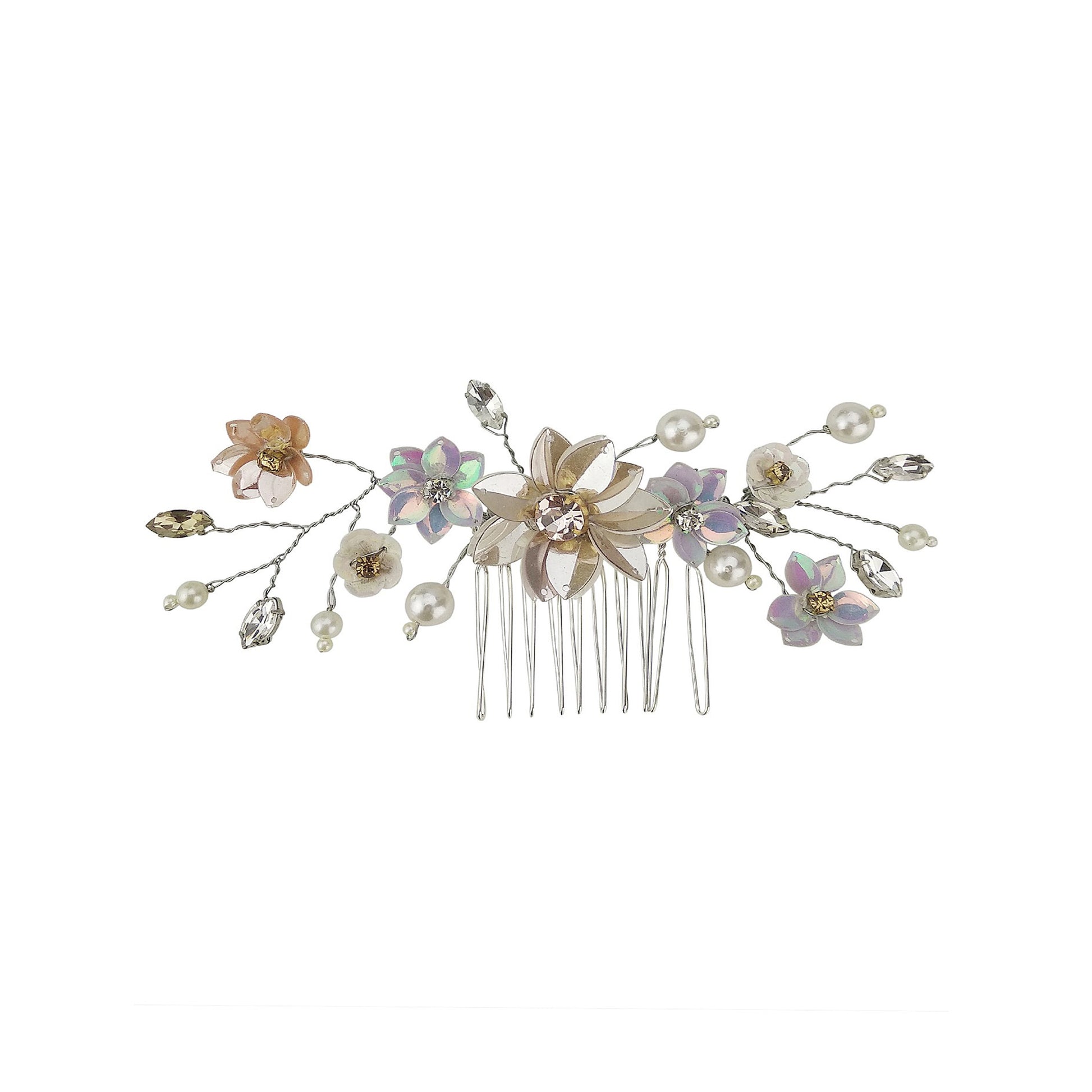 Featuring a Silver and Rainbow color floral Hair comb with crystals, metal sequins and Pearls embellishment set in steel..