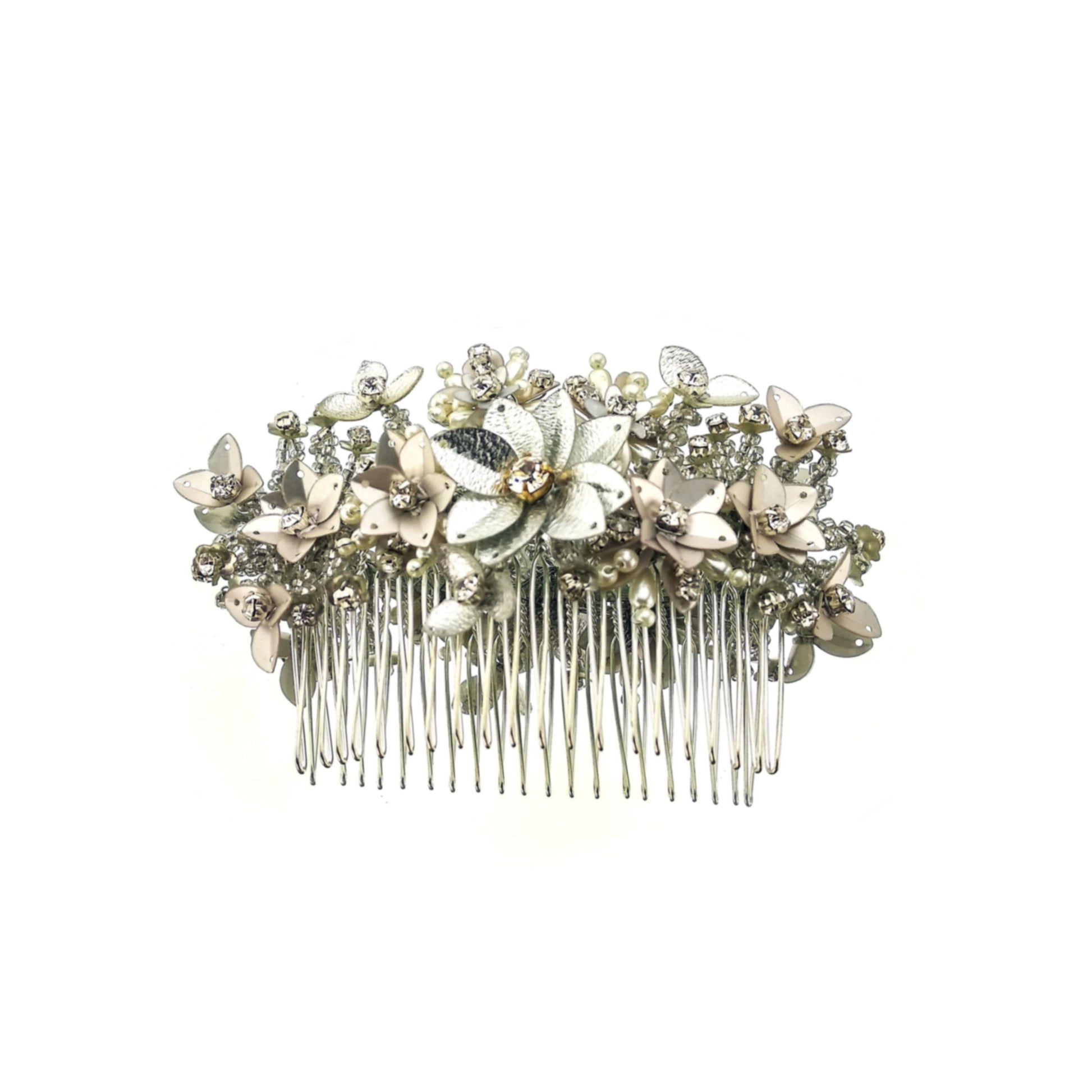Featuring a Silver Hair Comb hairclip with crystal stones, metal sequins and pearl embellishment, set in steel.