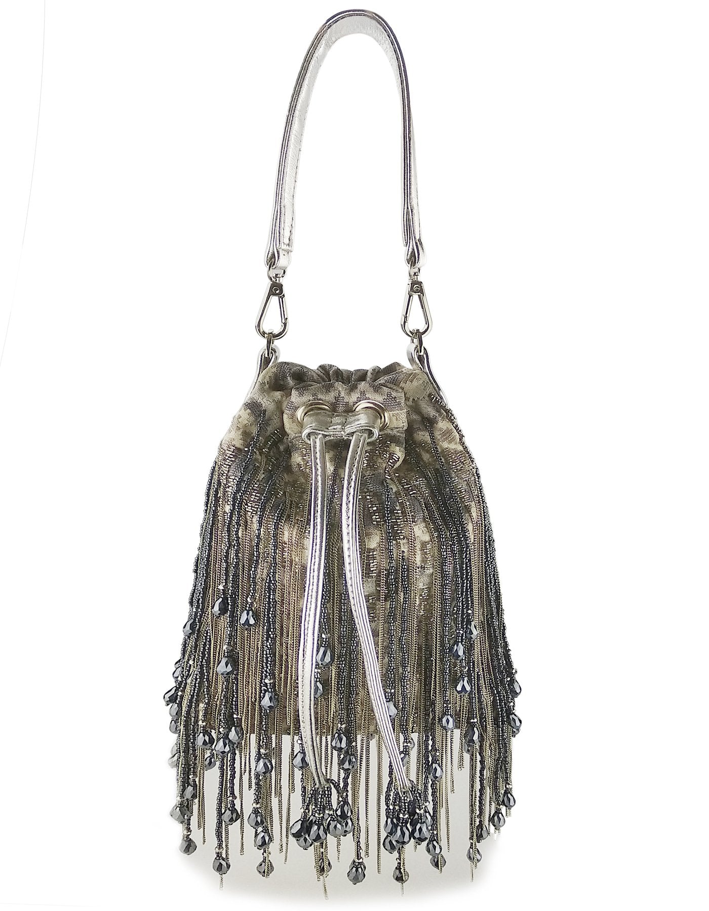 Featuring a silver color fabric chain tassels potli bag embellished with beads and chains hanging all over.
