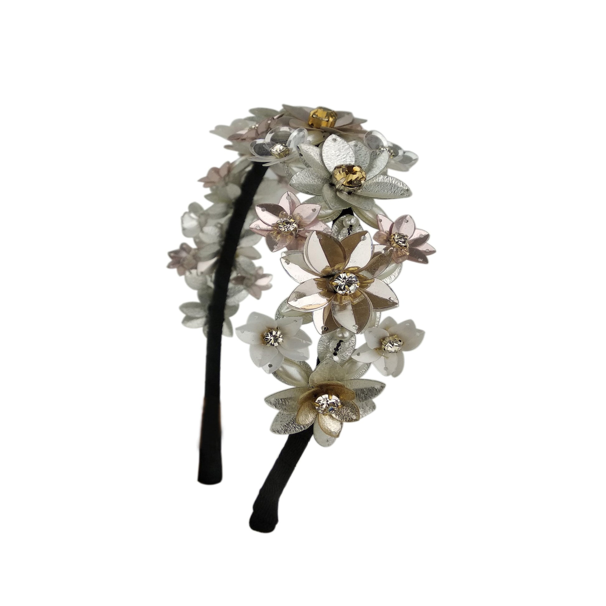 Featuring a Stunning woven hairband with Silver metal sequins, crystals and Pearls floral work embellishment..