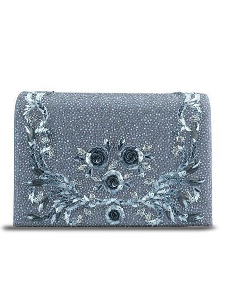 Featuring a hand beaded clutch bag with a Silver on silver flowery wreath design. It comes with a adjustable chain and gives a classy look to your ensemble. It is pure leather hand bag.