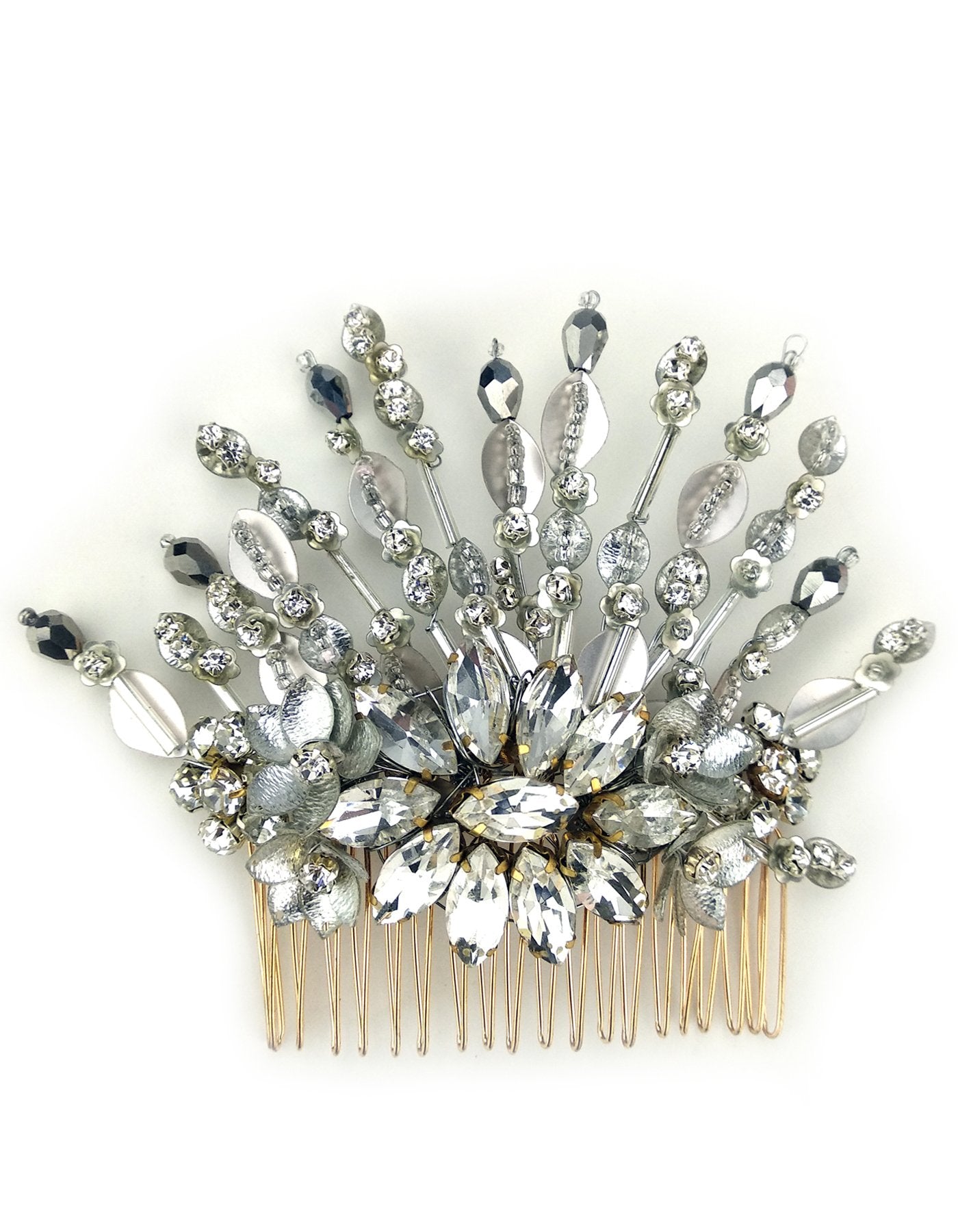 Featuring a Stunning Silver Hair Comb with crystals, sequins and beads floral motif embellishment..