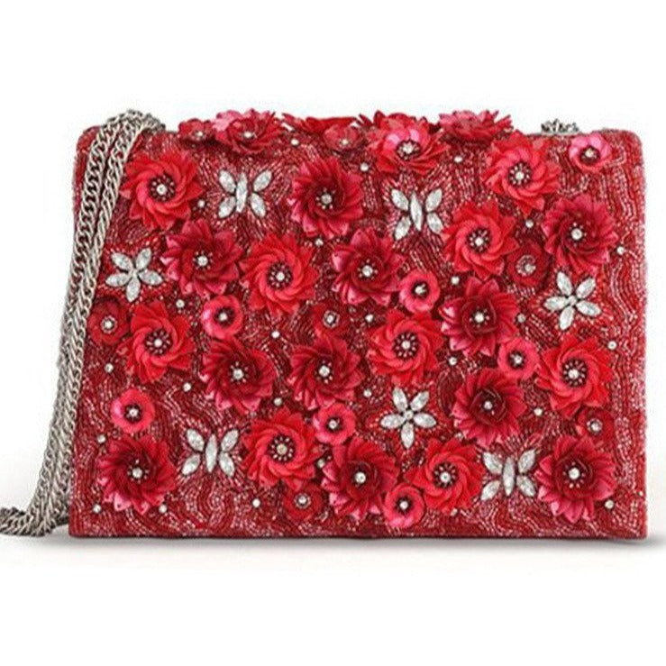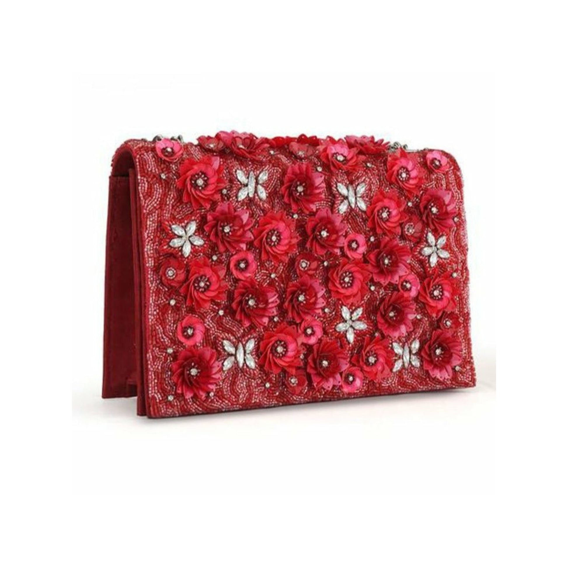 Featuring a Red colored hand beaded clutch bag. This is embellished with Red 3-D flowers and tiny sequence all over the bag, suspended with a sling chain.