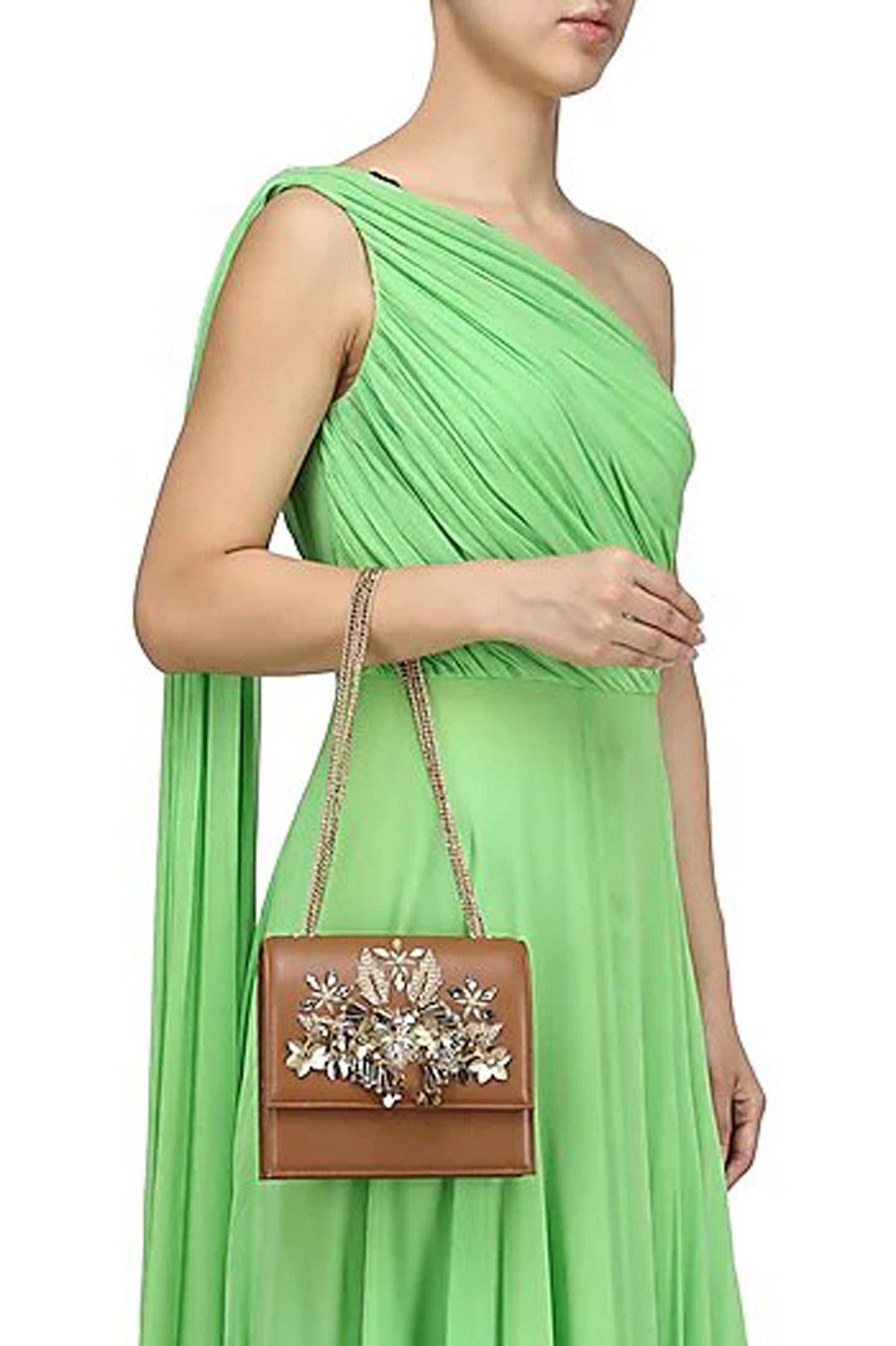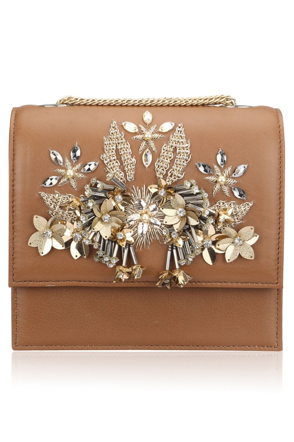 Featuring a Tan color floral leather clutch bag. This bag is embellished with crystal and sequins Golden color flowers on the bag, suspended with a adjustable Golden sling chain.