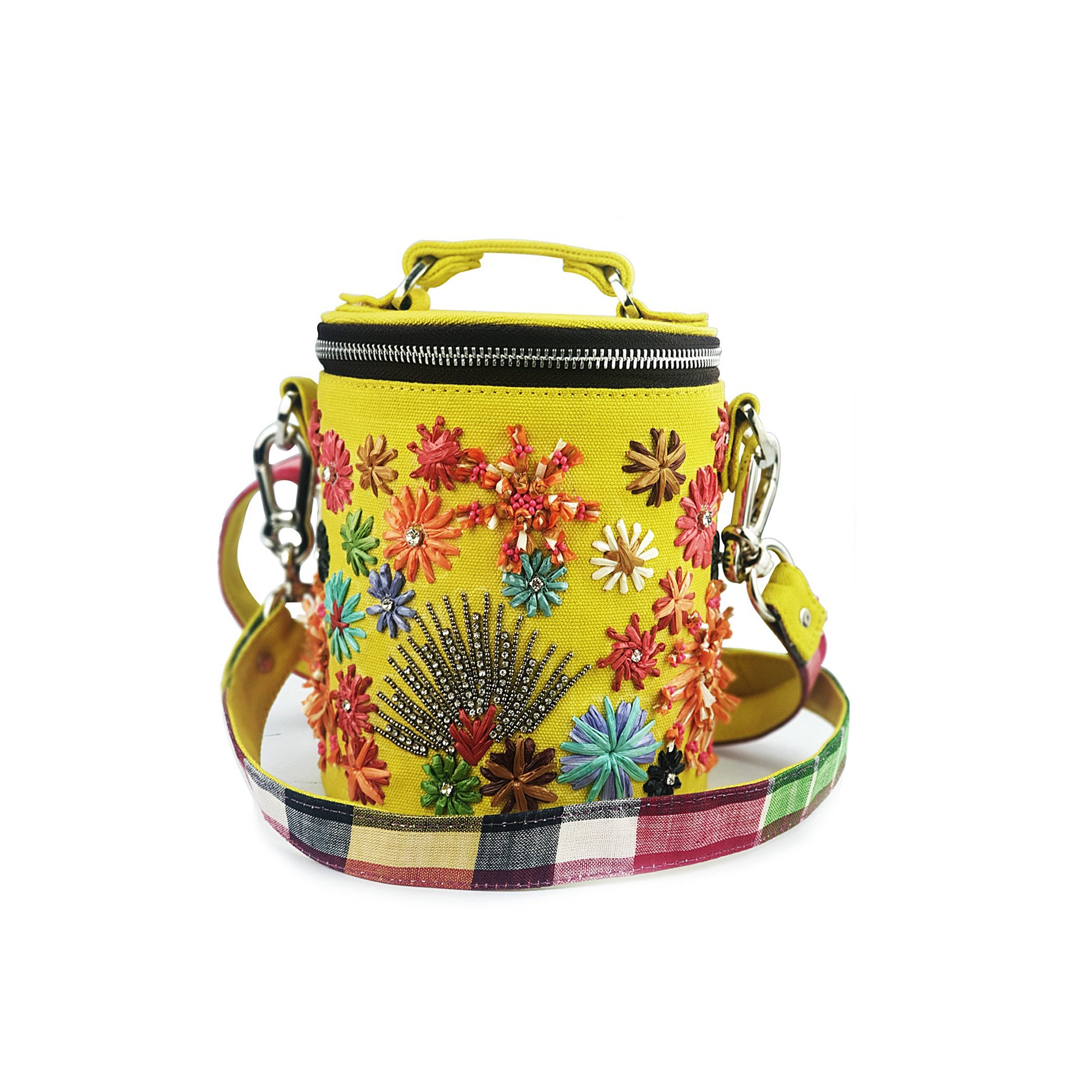 Featuring a Yellow base canvas hand bag sling bag embellished with crystals beads and floral hand embroidery work all over.