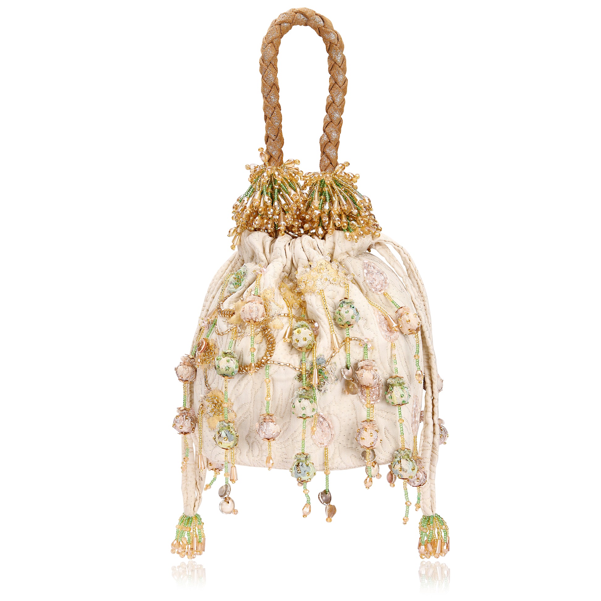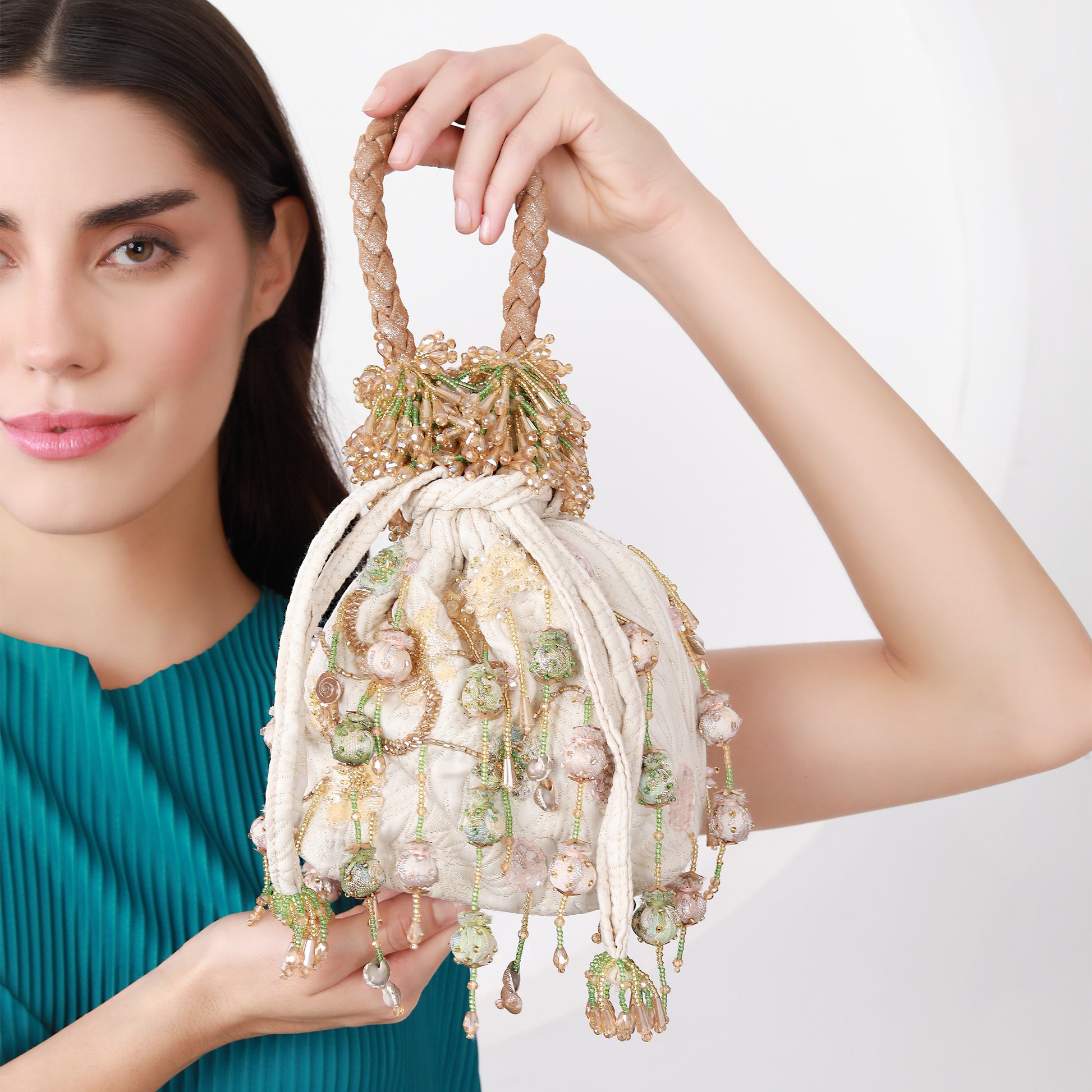 This silk jacquard fabric adds a touch of opulence, while the shell tassels infuse a hint of whimsy. Each patchwork detail is meticulously handcrafted, adorned with delicate beads and katdana for an artisanal touch. Embrace elegance with our unique potli, blending traditional craftsmanship with contemporary style.