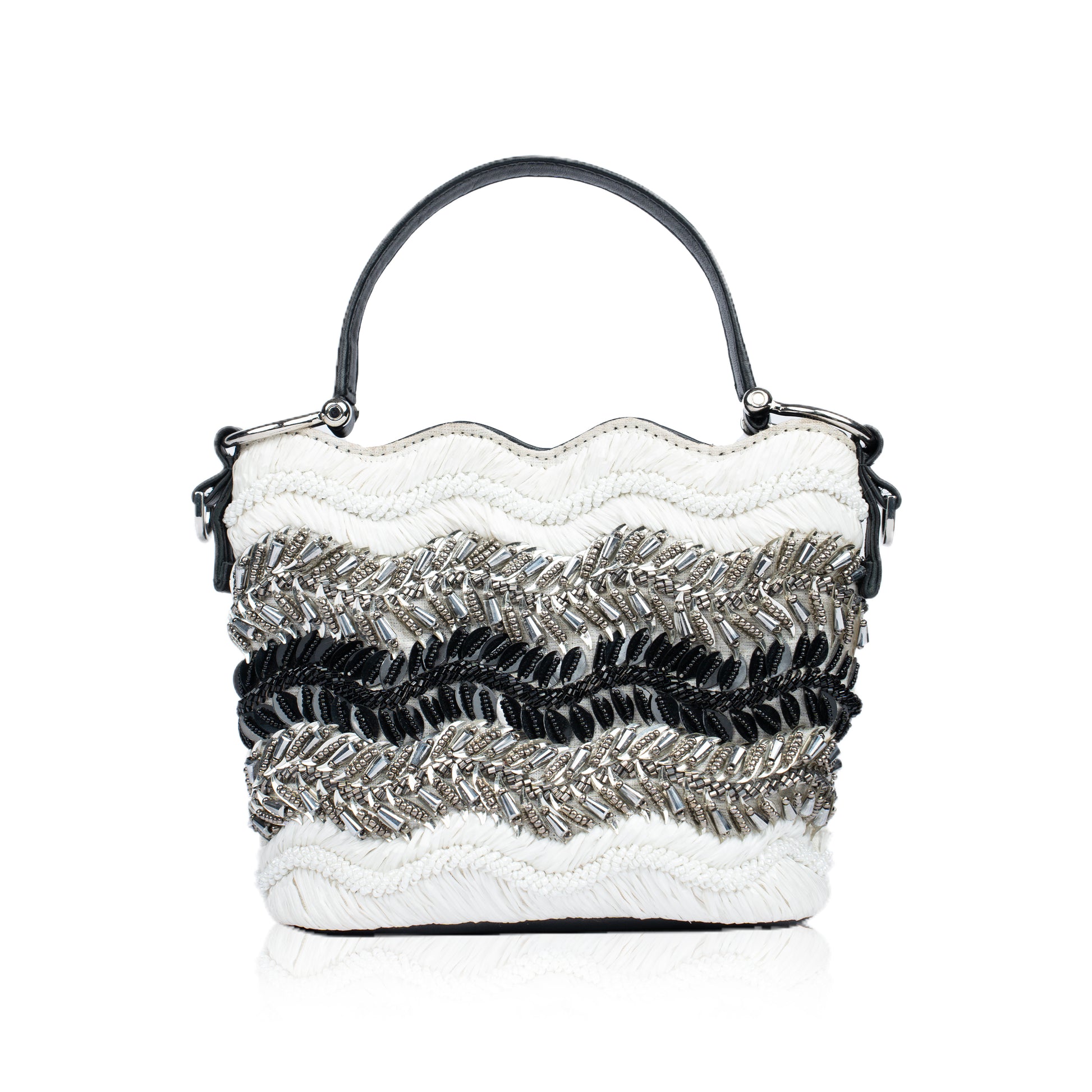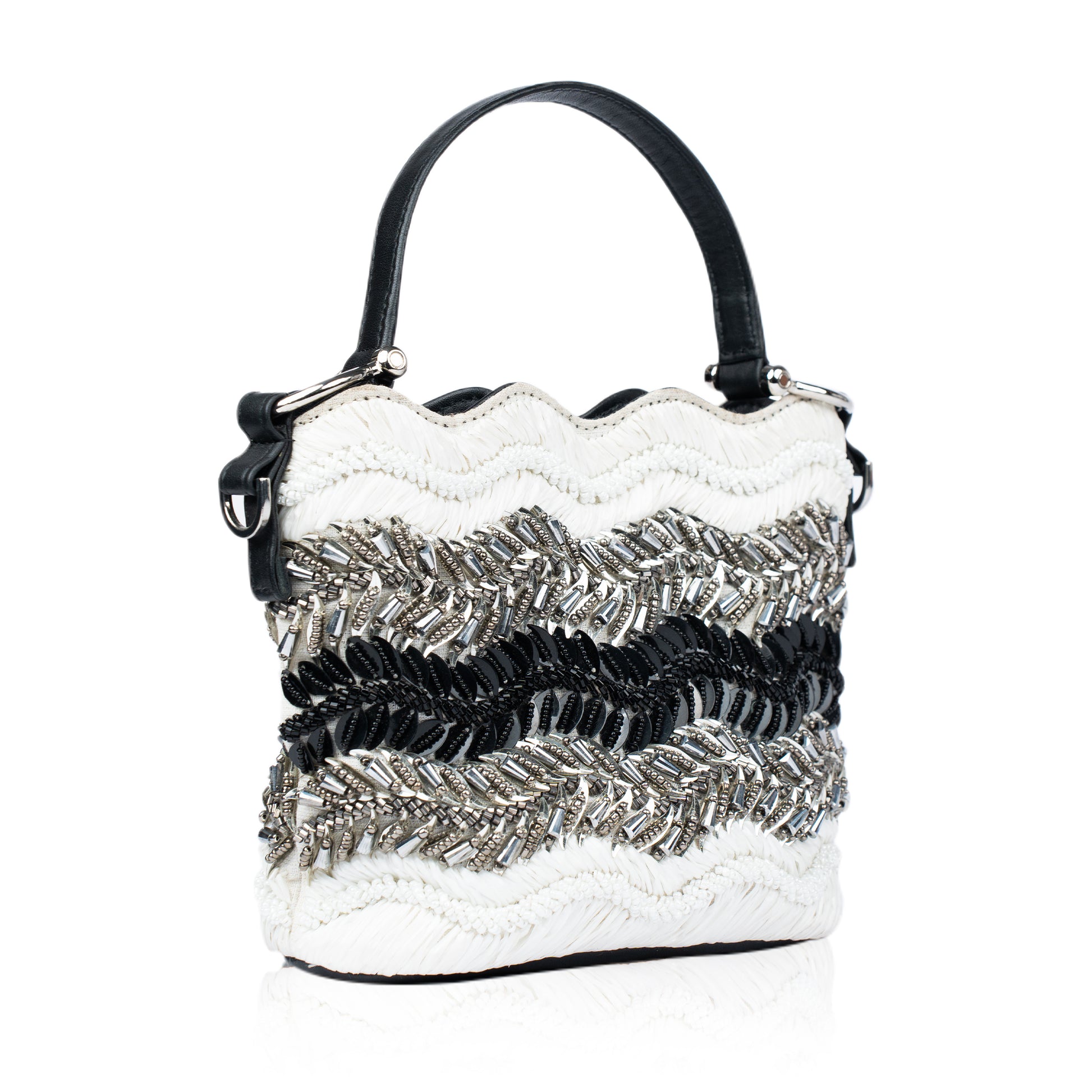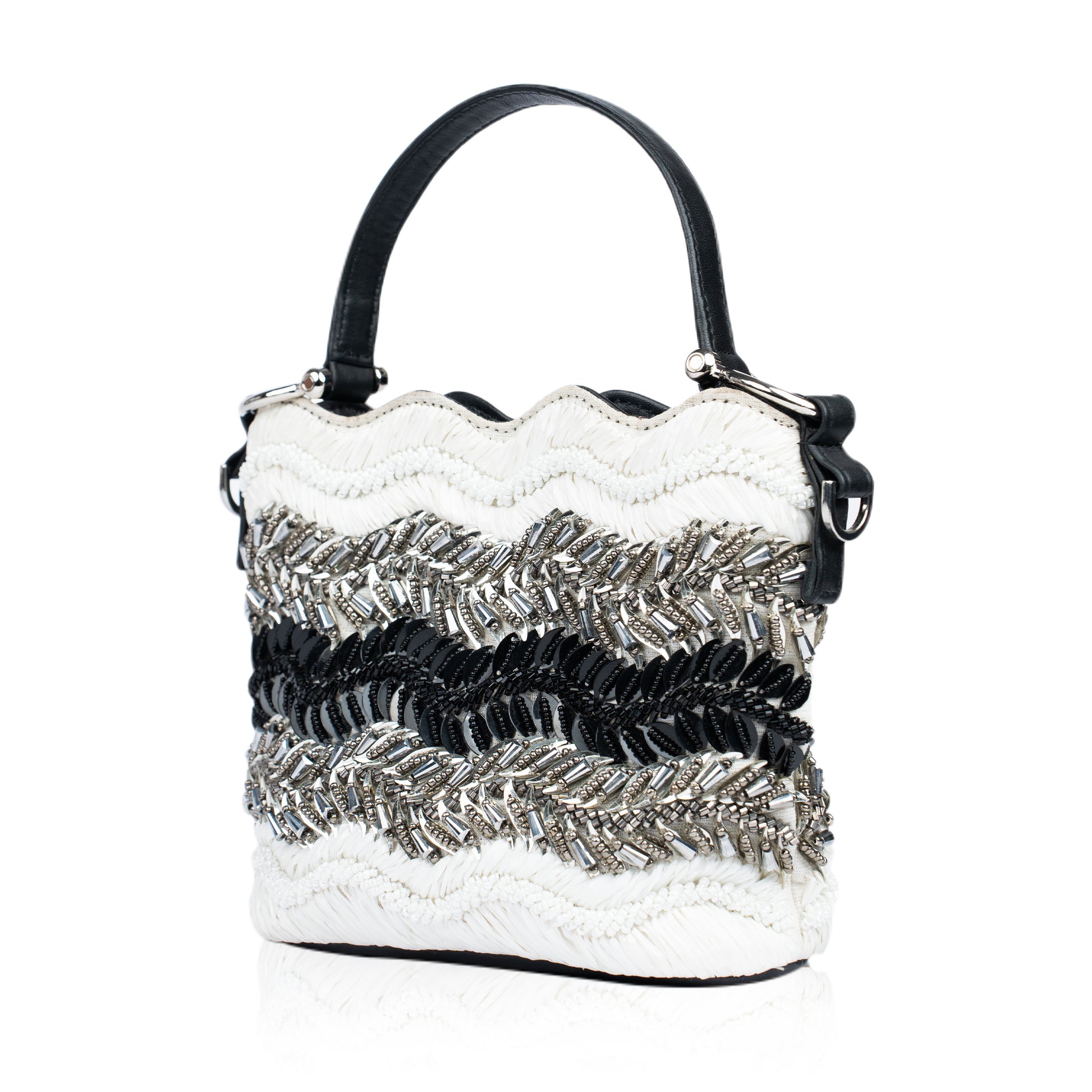 Introducing the Rafia Pearl Metal Sequins embellished hand beaded Leather base Canvas Bucket Bag. The intricate detailing of pearl metal sequins and beads adds a touch of glamour, making it a statement piece for any occasion.