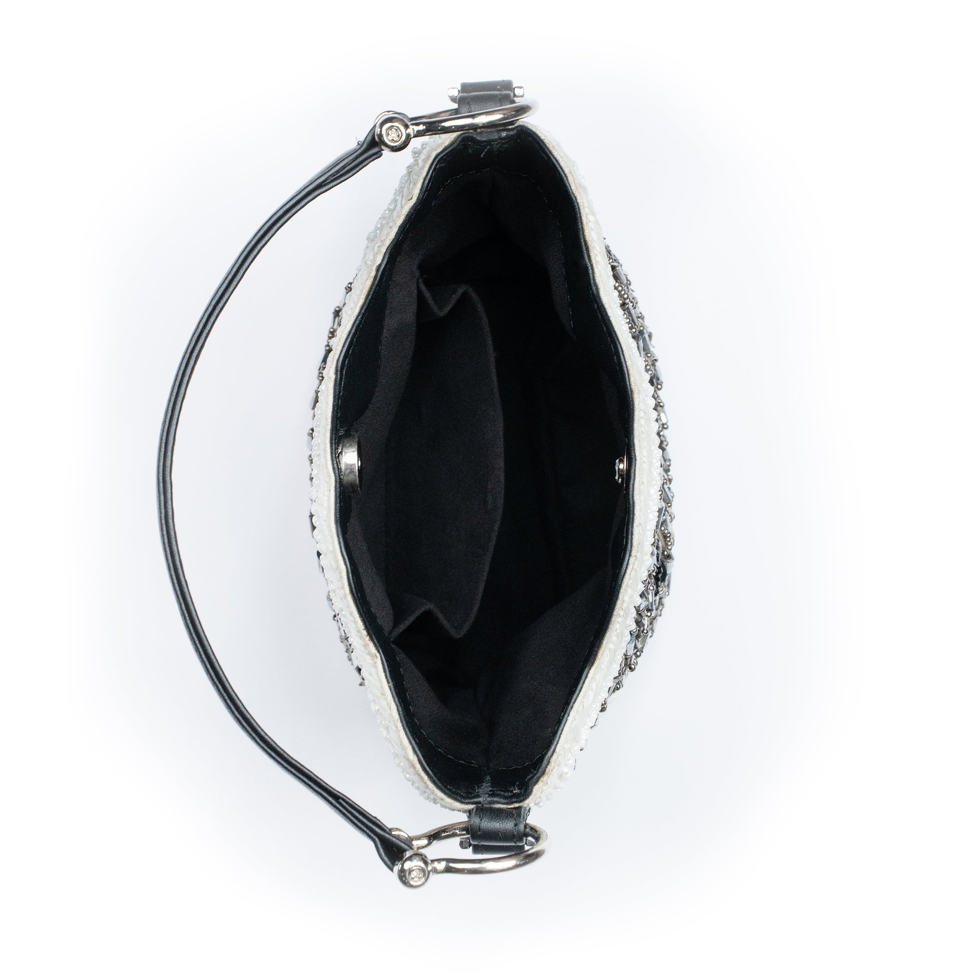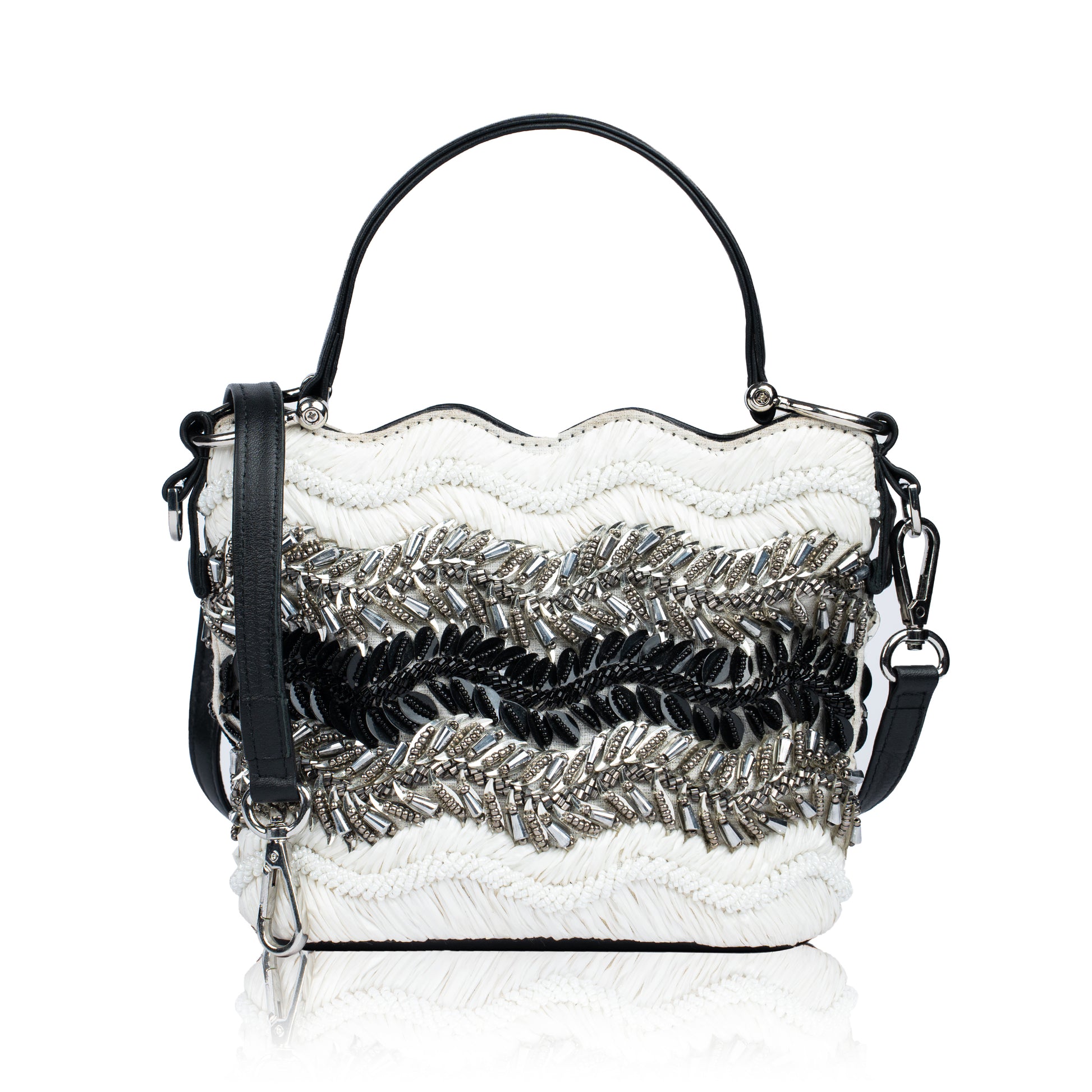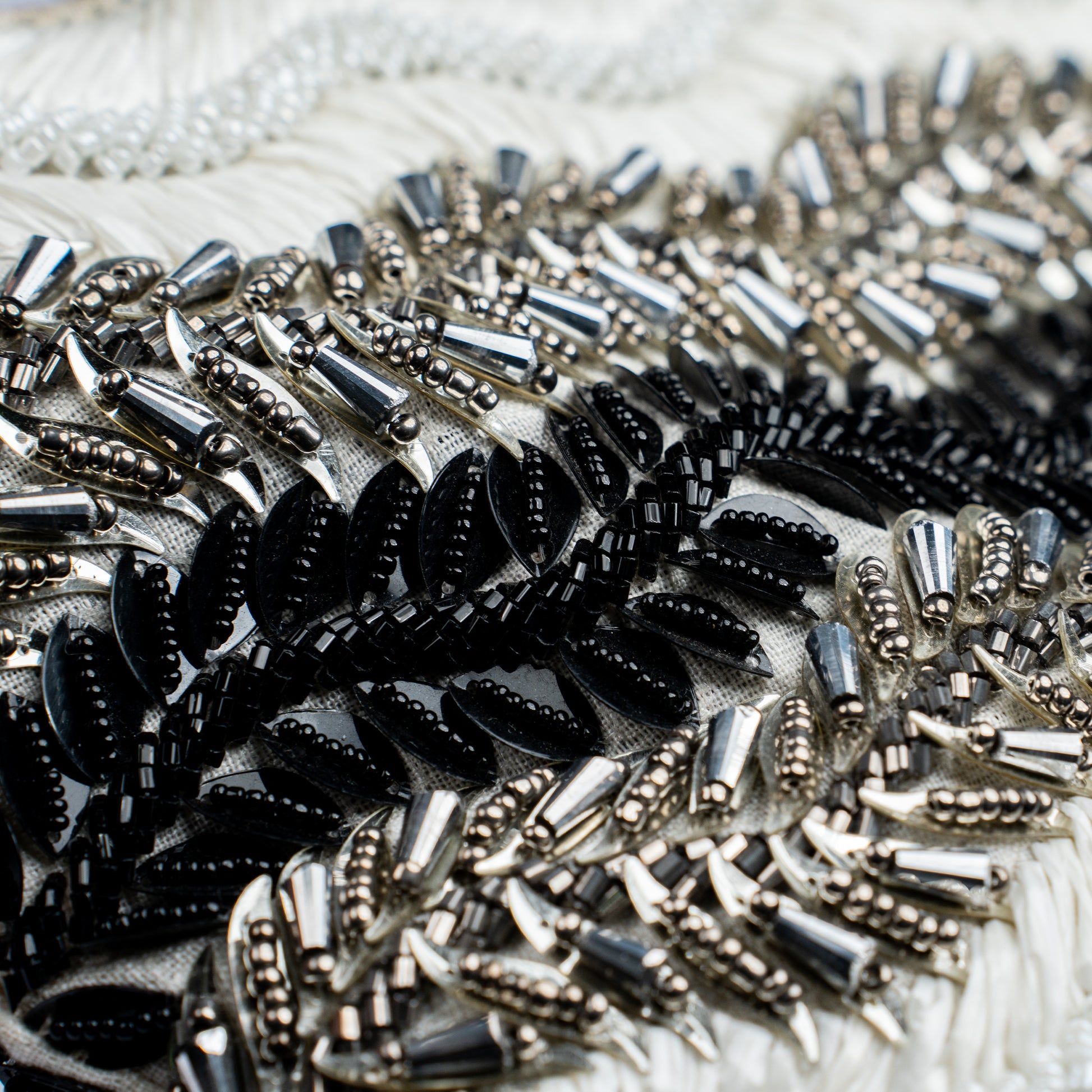 Introducing the Rafia Pearl Metal Sequins embellished hand beaded Leather base Canvas Bucket Bag. The intricate detailing of pearl metal sequins and beads adds a touch of glamour, making it a statement piece for any occasion.